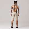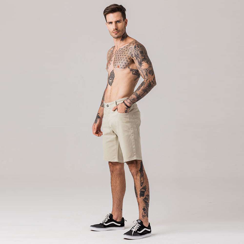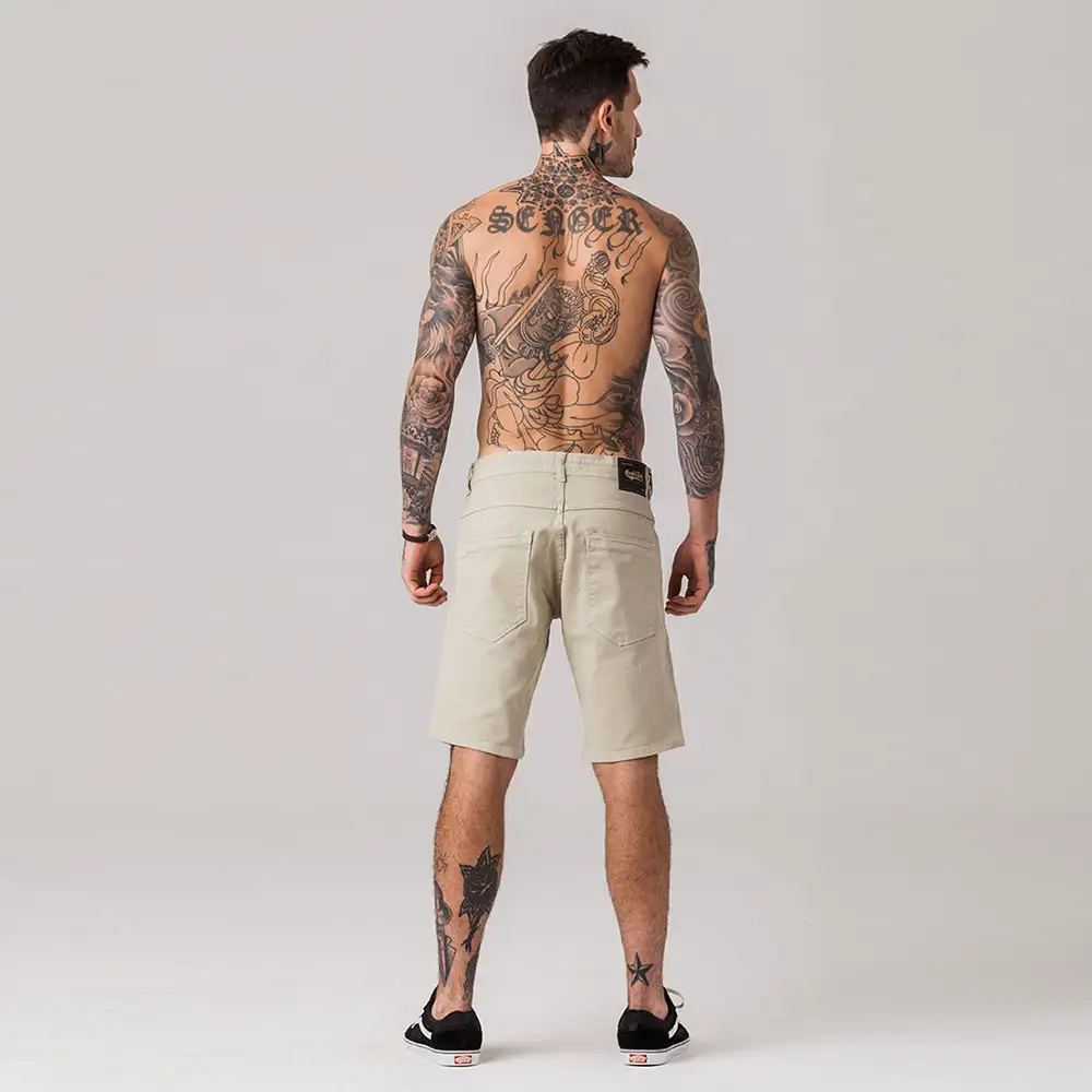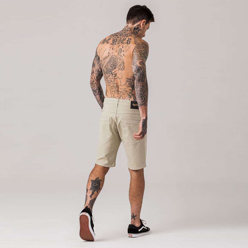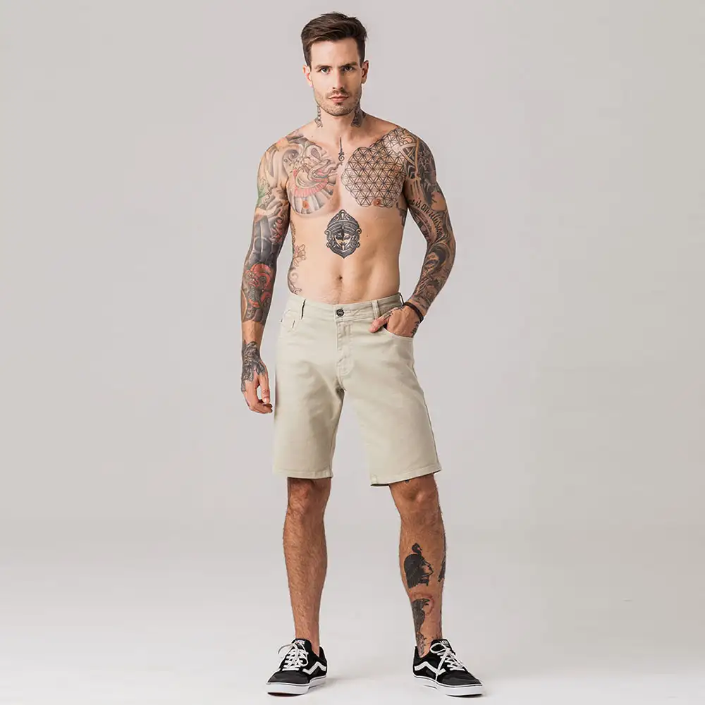 Bermuda masculina modelo slim, com modelagem mais solta ao corpo, confeccionada em tecido sarja. Possui fechamento por botão e zíper no entremeio, cós com passantes, bolsos funcionais frontais e traseiros, bolso porta moeda, e acabamento e costura no mesmo tom.