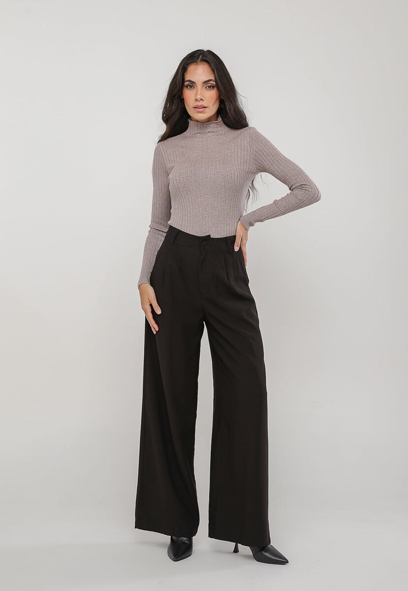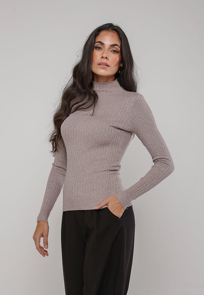 Blusa de Tricot Canelado Gola Alta Bege Salvatore
