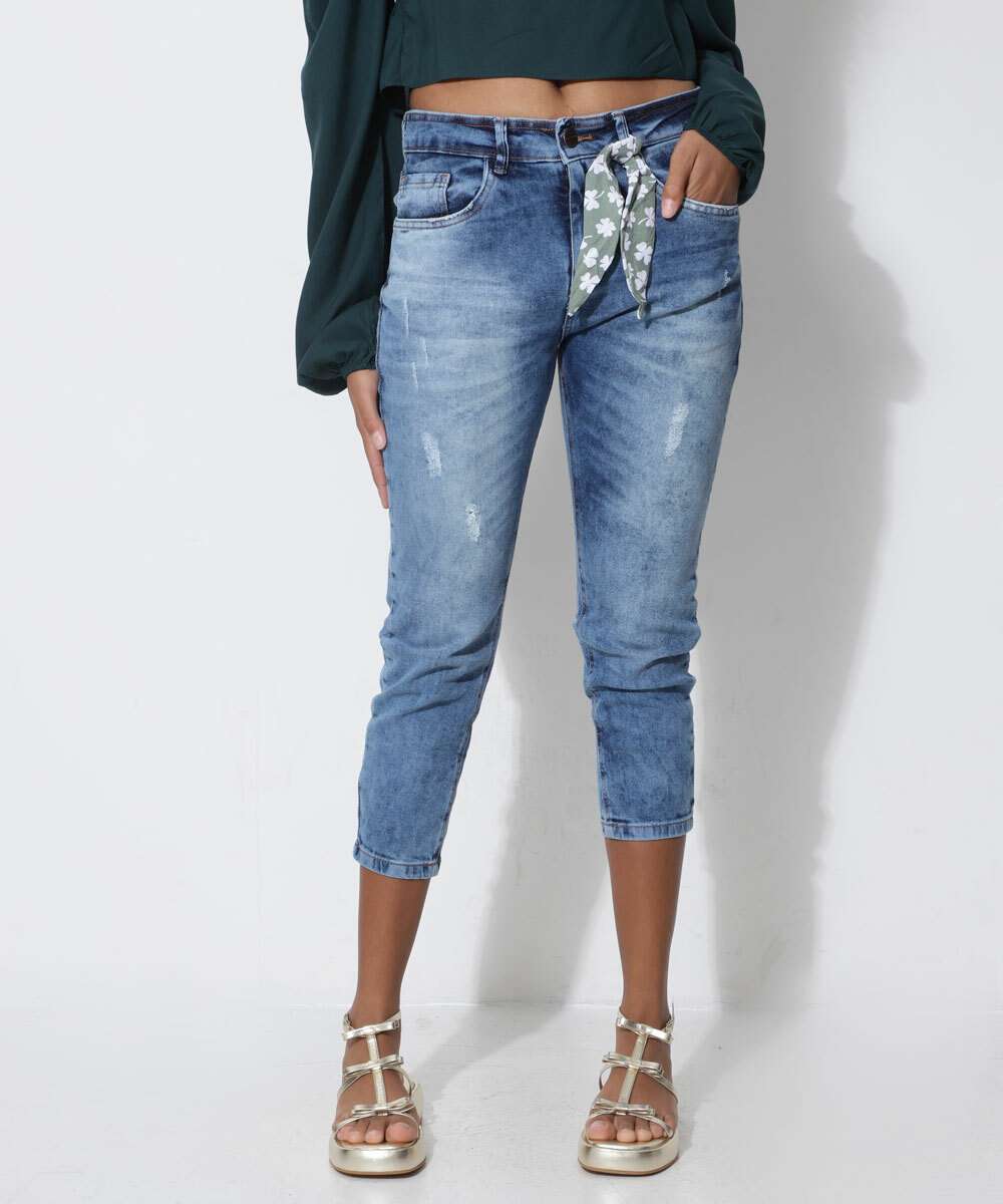 Calça feminina modelo capri cropped, confeccionada em tecido plano jeans com puídos. Possui fechamento por botão e zíper, cós com passantes, bolsos atrás e frontais, lenço de amarração estampado, acabamento no tom e costura contrastante.