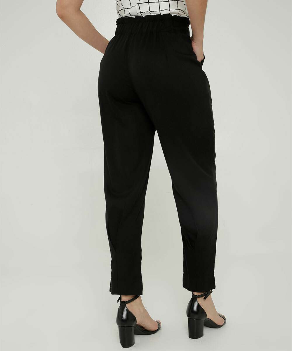 Calça feminina, modelo reta confeccionada em tecido plano viscose e liocel. Possui cintura alta, fechamento por botão e zíper no entremeio, cós franzido, bolsos frontais, acabamento e costura no tom.
