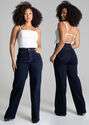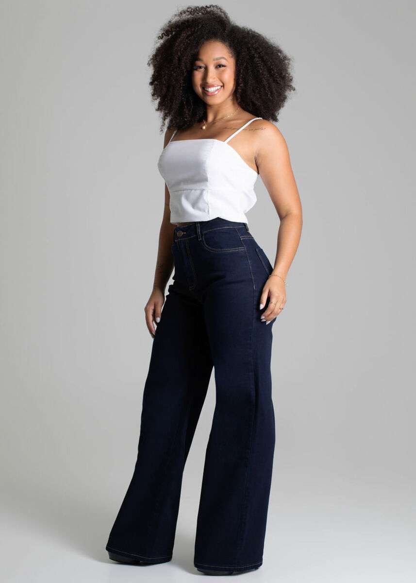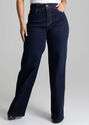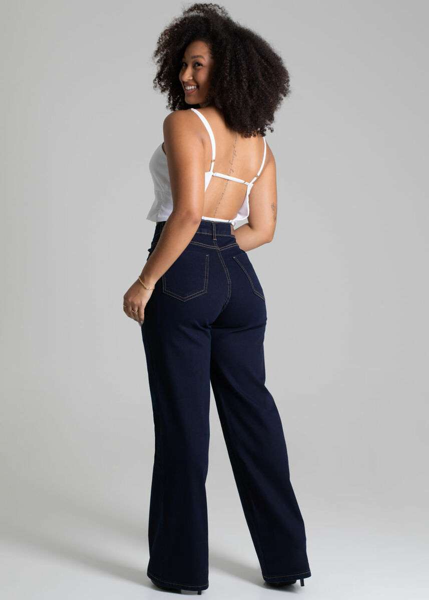 Calça feminina confeccionada em jeans. O modelo possui cintura super alta, gancho no lugar e caimento amplo da coxa até a barra. Cintura alta Fechamento através de um botão e zíper Bolsos frontais e posteriores funcionais Barra simples Tecido: Jeans Tipo de Lavagem: Azul Cor: Azul escuro