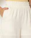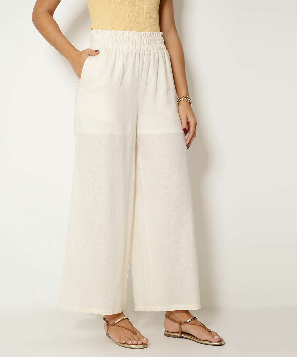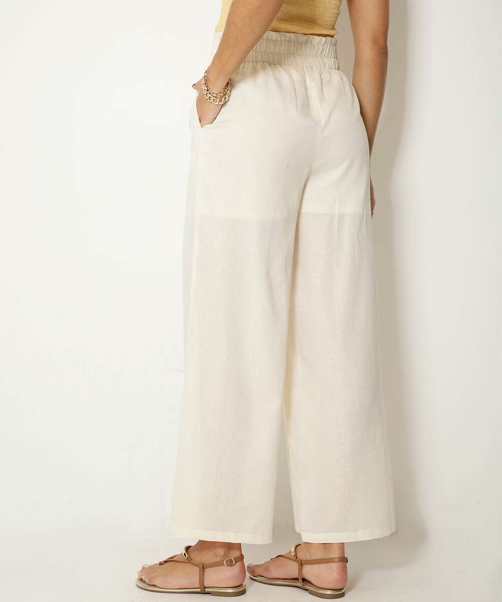 Calça feminina, modelo pantalona confeccionada em tecido plano viscose, algodão e linho. Possui forro em poliéster, cintura alta, cós elástico, bolsos frontais, acabamento e costura no tom.