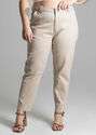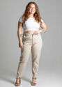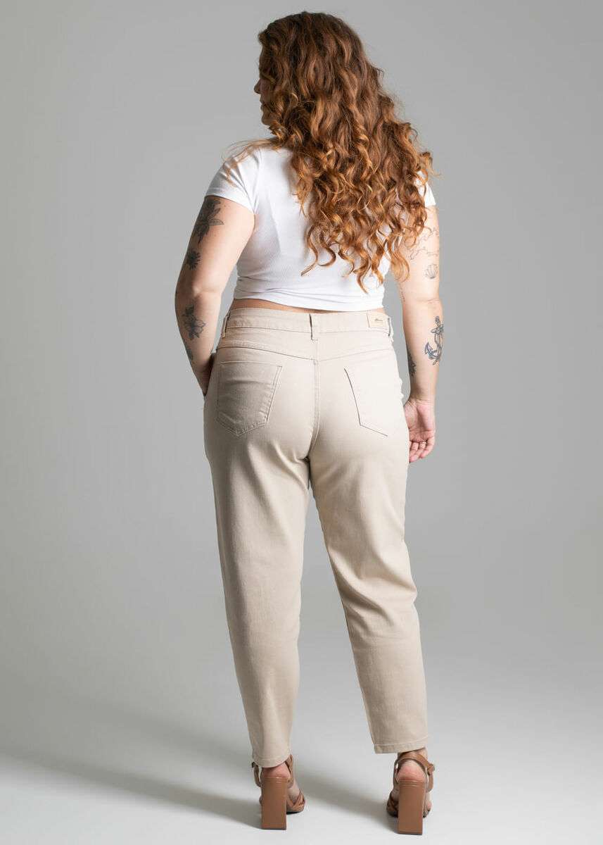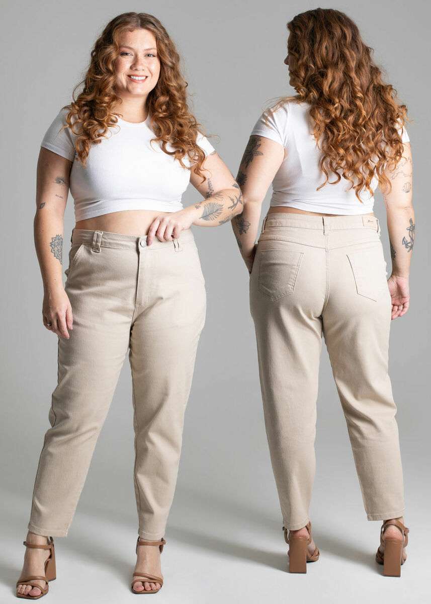 Calça plus size com recorte confeccionada em sarja. A modelagem mom tem um caimento soltinho nos quadris e coxas ajustando até o tornozelo. Cintura alta Fechamento com botão e zíper Bolsos frontais e bolsos traseiros funcionais Barra simples Modelagem: Mom Tecido: Sarja Tipo de lavagem: Color Cor: bege