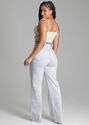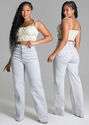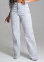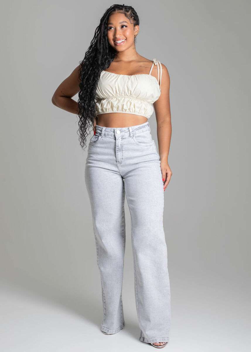 Calça feminina confeccionada em jeans. O modelo possui cintura super alta, gancho no lugar e caimento amplo da coxa até a barra. Cintura alta Fechamento através de um botão e zíper Bolsos frontais e posteriores funcionais Barra simples Tecido: Jeans Tipo de Lavagem: color Cor: cinza