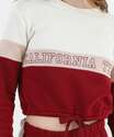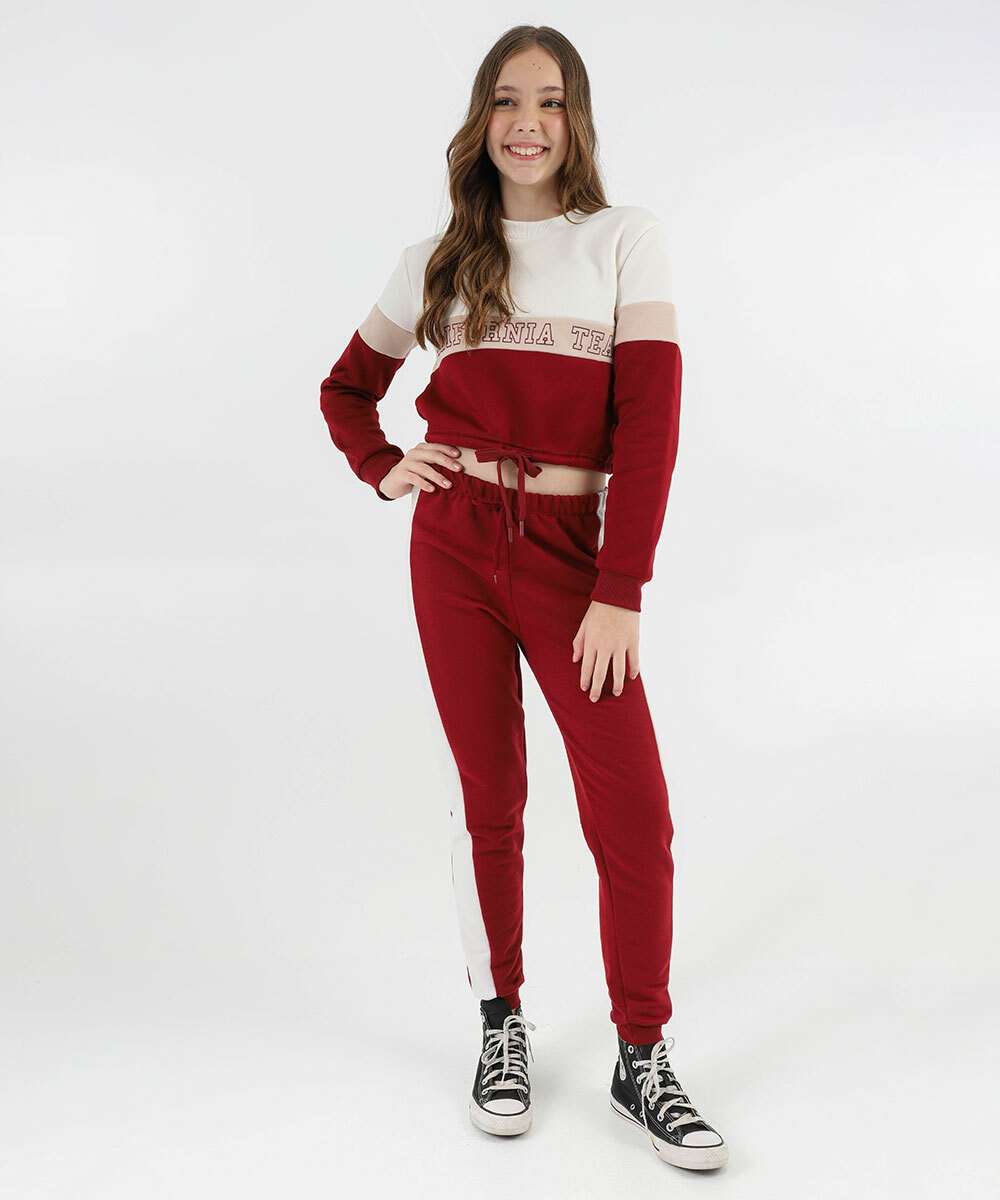 Casaco juvenil, modelo cropped, ideal para meninas de 10 até 16 anos de idade, confeccionado em malha moletom flanelado. Possui estampa frontal frase, recorte em tom contrastante, manga longa, tiras de amarração, acabamento em ribana e costura no tom.