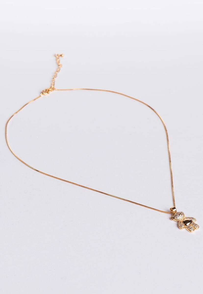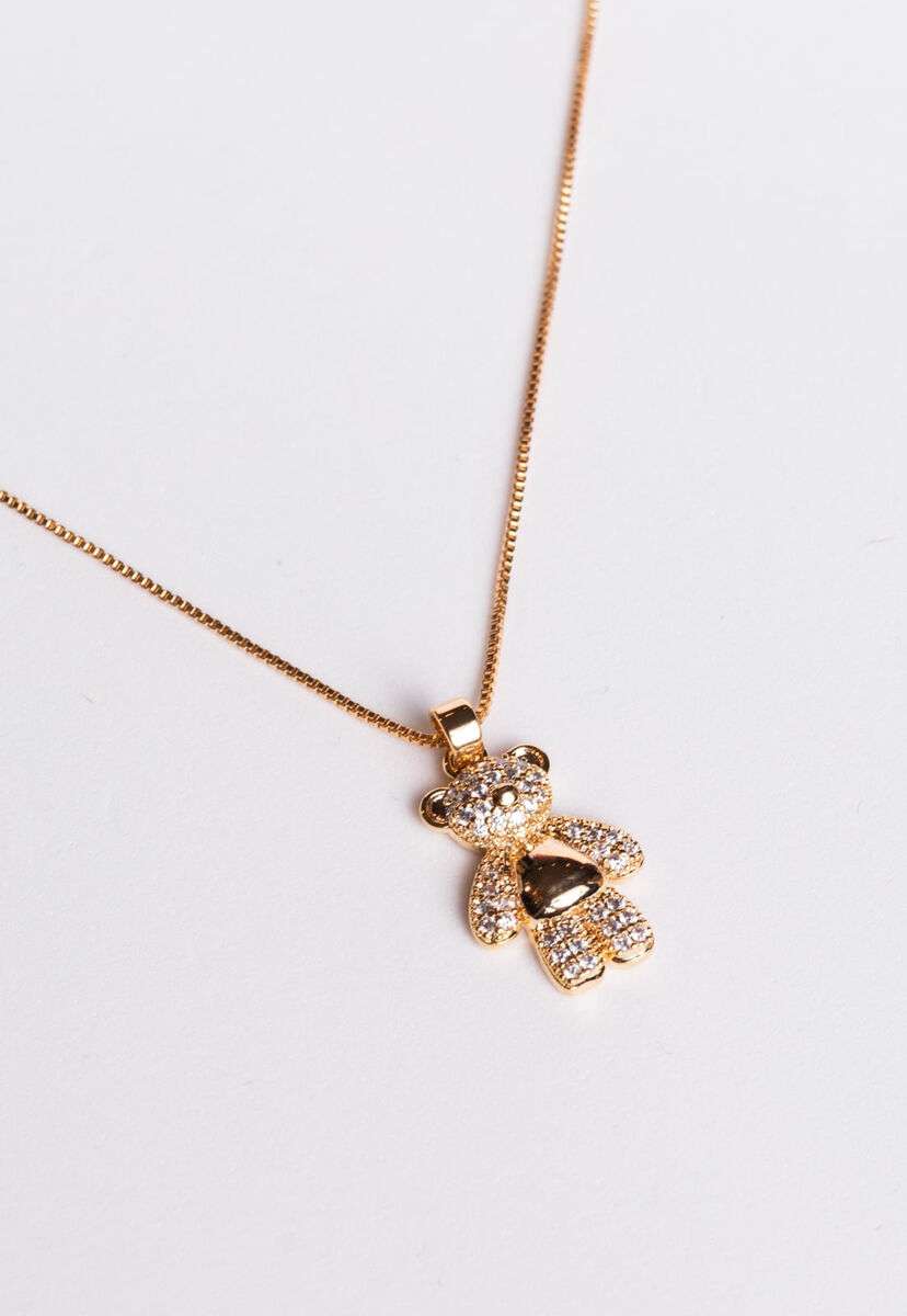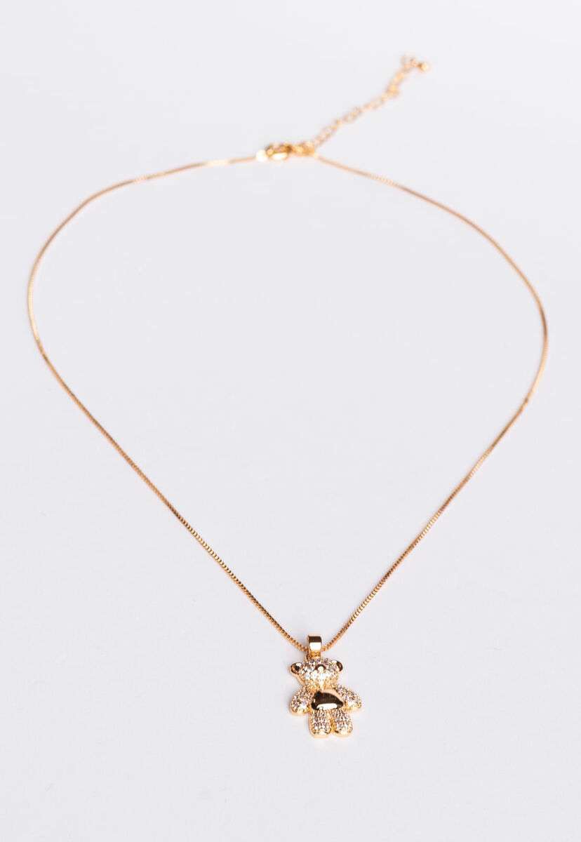 Colar delicado com corrente fina dourada e pingente em formato de ursinho, cravejado com pequenas pedras brilhantes que trazem elegância e charme à peça. Ideal para complementar looks casuais ou sofisticados, sendo uma escolha perfeita para presentear ou dar um toque especial ao visual. CARACTERÍSTICAS: - Modelo: colar feminino- Medida aproximada: 43cm + 5cm de extensor- Peso: 11 gr.- Tipo de fechamento: garra de lagosta- Material: metal ATENÇÃO! Para manter sua peça bonita e brilhante por mais tempo, evite contato com a água e com a transpiração intensa. Não é recomendado tomar banho com sua peça, nem usá-la no mar ou piscina. Lembre-se: a oxidação da peça é um processo natural, e a obervação dos cuidados mencionados acima é fundamental para prolongar a vida útil da mesma.