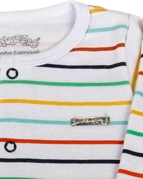 Conjunto para Bebê feito com Suedine Fio 40/1 100% Algodão. É uma malha extremamente macia e delicada, muito indicada para a pele fininha e sensível do bebê. O conjunto pode ser usado no dia a dia ou também como pijama de bebê. Ele é composto por:- Casaquinho de bebê feito em suedine listrado com aplicação de plaquinha personalizada, gola com viés, barras viradas e fechado com botões de pressão. Body de bebê em Suedine Estampado, gola tipo canoa com acabamento em viés e fechado com botões de pressão. Calça tipo Culote feita em suedine liso com pezinhos fechados e elástico embutido na cintura.