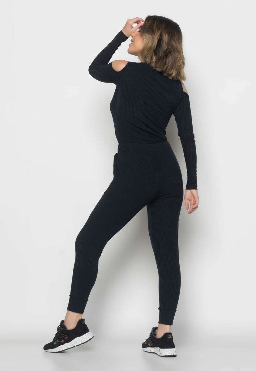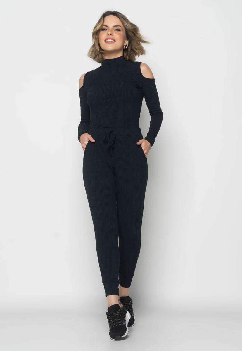 Conjunto Comfy Com Blusa Ombro Vazado M/L e Jogger Canelada Preto Salvatore