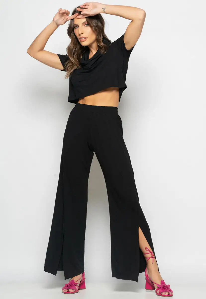 Conjunto Cropped Golão E Calça Fenda Frontal Malha Preto Salvatore