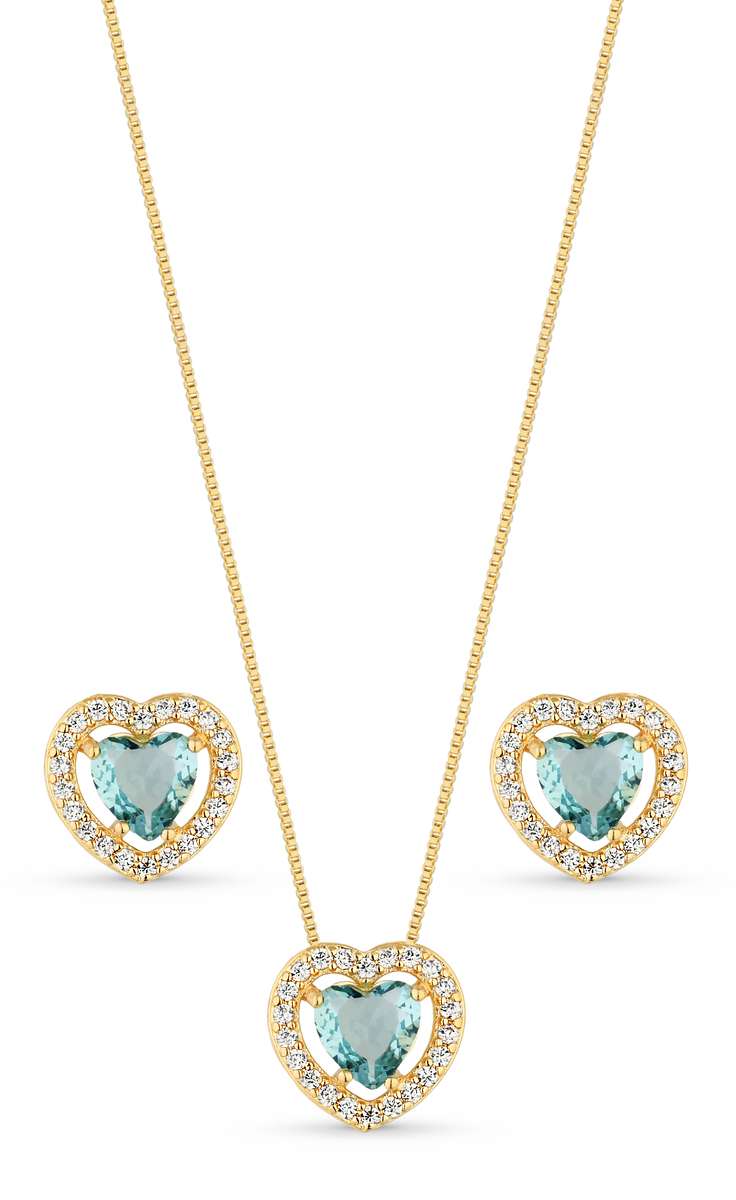 Produzido em metal nobre banhado a ouro 18k, cada peça é finalizada com alto padrão de polimento e microzircônias cravejadas, garantindo luminosidade intensa e acabamento impecável. O design em coração traduz amor e feminilidade, tornando o conjunto ideal tanto para ocasiões especiais quanto para valorizar os looks do dia a dia.Com 40 cm de comprimento e extensor de 5 cm, o colar é versátil, podendo ser usado sozinho ou em composições.Um presente perfeito ou um mimo especial para você mesma. CARACTERÍSTICAS • Categoria: Conjunto (colar + pingente + brincos)• Banho: Ouro 18k• Medidas colar: 40 cm corrente + 5 cm extensor• Corrente: Modelo Veneziana• Peso: 5,5 gramas• Pedra: Cor azul Claro e Micro zircônias• NÍQUEL FREE: Peça Hipoalergênica - INFORMAÇÕES ADICIONAIS -. Todas as peças possuem tecnologia antialérgica.• Todas as peças possuem até 10 milésimos de banho e garantia de 6 meses - CUIDADOS -• Para manter sua peça bonita e brilhante por mais tempo evite contato com a água e com a transpiração intensa. Não é recomendado tomar banho com sua peça, nem usá-la no mar ou piscina! Lembre-se: a oxidação da sua semijoia é um processo natural, a observação dos cuidados mencionados acima é fundamental para prolongar a vida útil da sua peça.• Quando passar perfume, hidratante, álcool 70% ou outro produto químico na pele, aguarde secar totalmente para vestir sua peça.• Se molhar a sua semijoia, use uma flanela seca para tirar o excesso e deixe-a secando naturalmente à sombra.• É importante guardar suas peças separadamente, assim evita o atrito entre as mesmas.