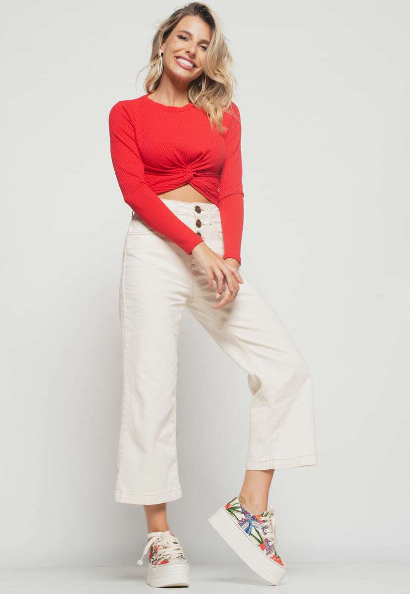 Cropped Nó Manga Longa Canelada Vermelho Salvatore Fashion