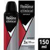 Desodorante Rexona Aero Clinical Sport 150mlO Desodorante Rexona Aero Clinical Sport 150ml é a solução perfeita para quem busca proteção intensa e duradoura contra o suor e os odores. Com uma fórmula avançada, ele oferece até 48 horas de proteção, mantendo você fresco e confiante durante todo o dia, mesmo nas atividades mais intensas. Indicação:Indicado para pessoas ativas que necessitam de uma proteção eficaz contra o suor, ideal para práticas esportivas e atividades do dia a dia. Tecnologia:Ação Antitranspirante: Bloqueia a transpiração e combate o odor.Fórmula Clinicamente Testada: Garante eficácia de longa duração sem irritar a pele.Benefícios:Proteção contra suor e odor por até 48 horas.Fórmula leve que não deixa resíduos brancos.Ideal para quem pratica esportes ou tem um dia corrido.Seca rapidamente, proporcionando conforto imediato.Modo de Uso:Agite bem antes de usar.Aplique a uma distância de 15 cm das axilas.Deixe secar antes de vestir.Resultado:Com o Desodorante Rexona Aero Clinical Sport, você terá a segurança de estar protegido em qualquer situação, permitindo que você se concentre no que realmente importa. Contém: 01 - Desodorante Rexona Aero Clinical Sport 150ml. Precauções:Mantenha em local fresco e ao abrigo da luz. Uso externo. Evite o contato com os olhos. Em caso de irritação, interrompa o uso. Mantenha fora do alcance de crianças. Informações Adicionais:Não realizamos testes em animais. Número do processo ANVISA: 25351.158981/2018-61. Imagens meramente ilustrativas.