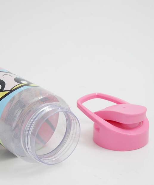 Garrafa modelo squeeze, confeccionada em plástico com brilho, capacidade para 750ml de líquido. Possui meninas super poderosas, alça, fechamento por tampa giratória e acabamento no tom.