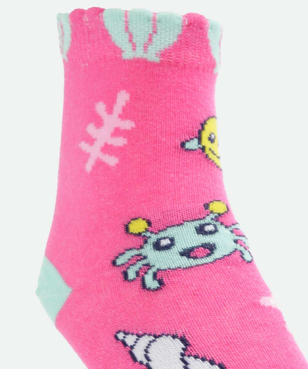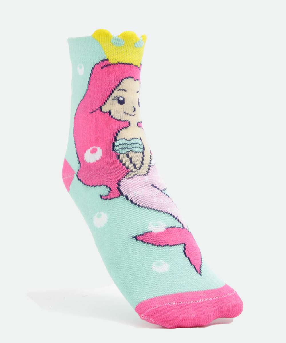 Kit infantil, composto por dois pares de meias modelo soquete, confeccionadas em malha. Possui um par com estampa 3D sereia e um par com estampa fundo do mar, acabamento em ribana e costura no tom.