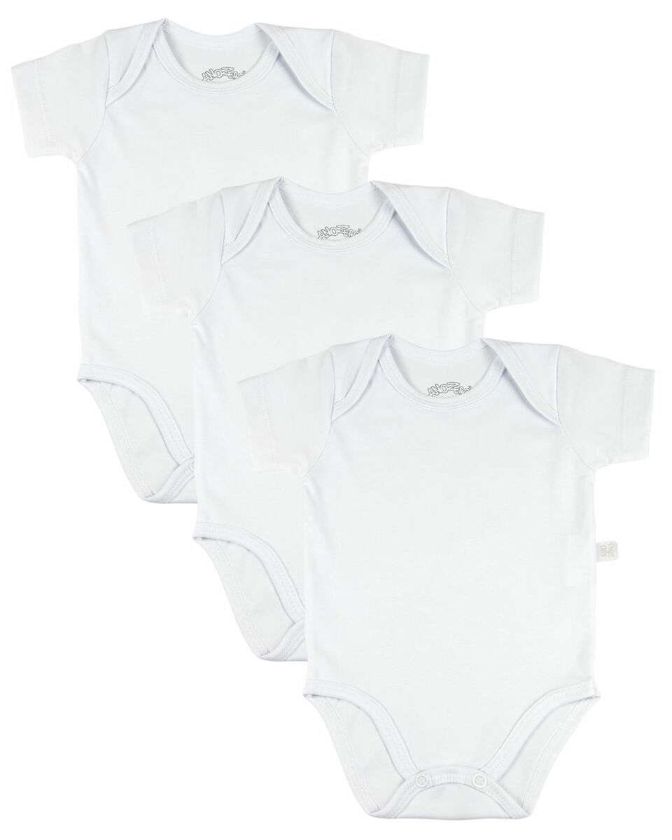 Kit Body Bebê Manga Curta feito em Malha Conforto, que é um Cotton bem fininho, com excelente elasticidade e maciez, que proporciona ao bebê dias e noites super tranquilas, pois ele é muito indicado para a sua pele fininha pela sua maciez e por não causar irritações. Eles possuem gola tipo canoa, a mais prática de trocar, acabamentos em viés da própria malha e fechamento inferior com botões de pressão. Não possui etiqueta na gola pra evitar irritações e alergias no pescocinho. As peças podem ser vendidas individualmente, porém o preço unitário é de R$ 34,45.