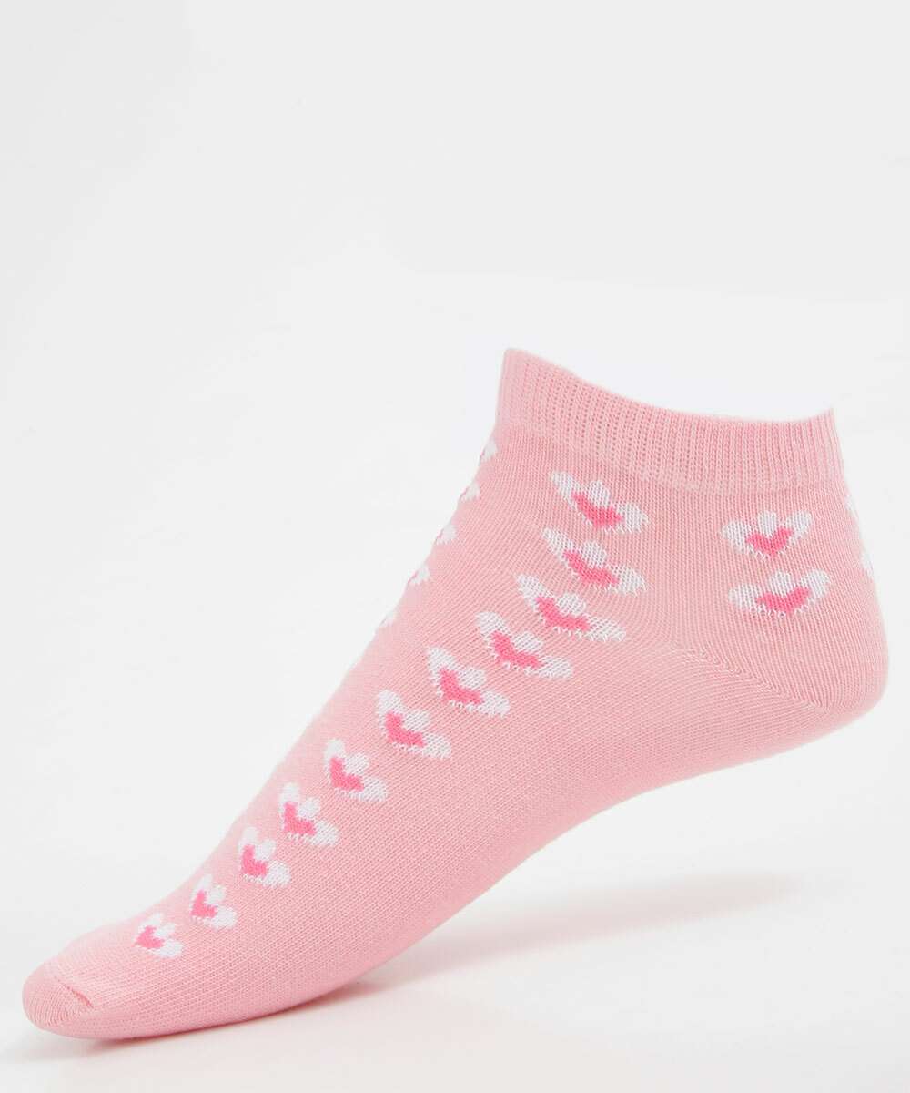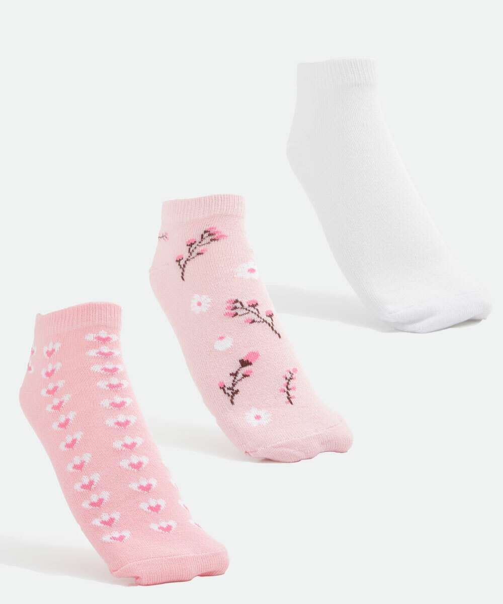 Kit feminino, composto por três pares de meias modelo cano curto, confeccionadas em malha. Possui um par liso, um par com estampa flores e um par com estampa corações, acabamento em ribana e costura no tom.