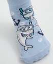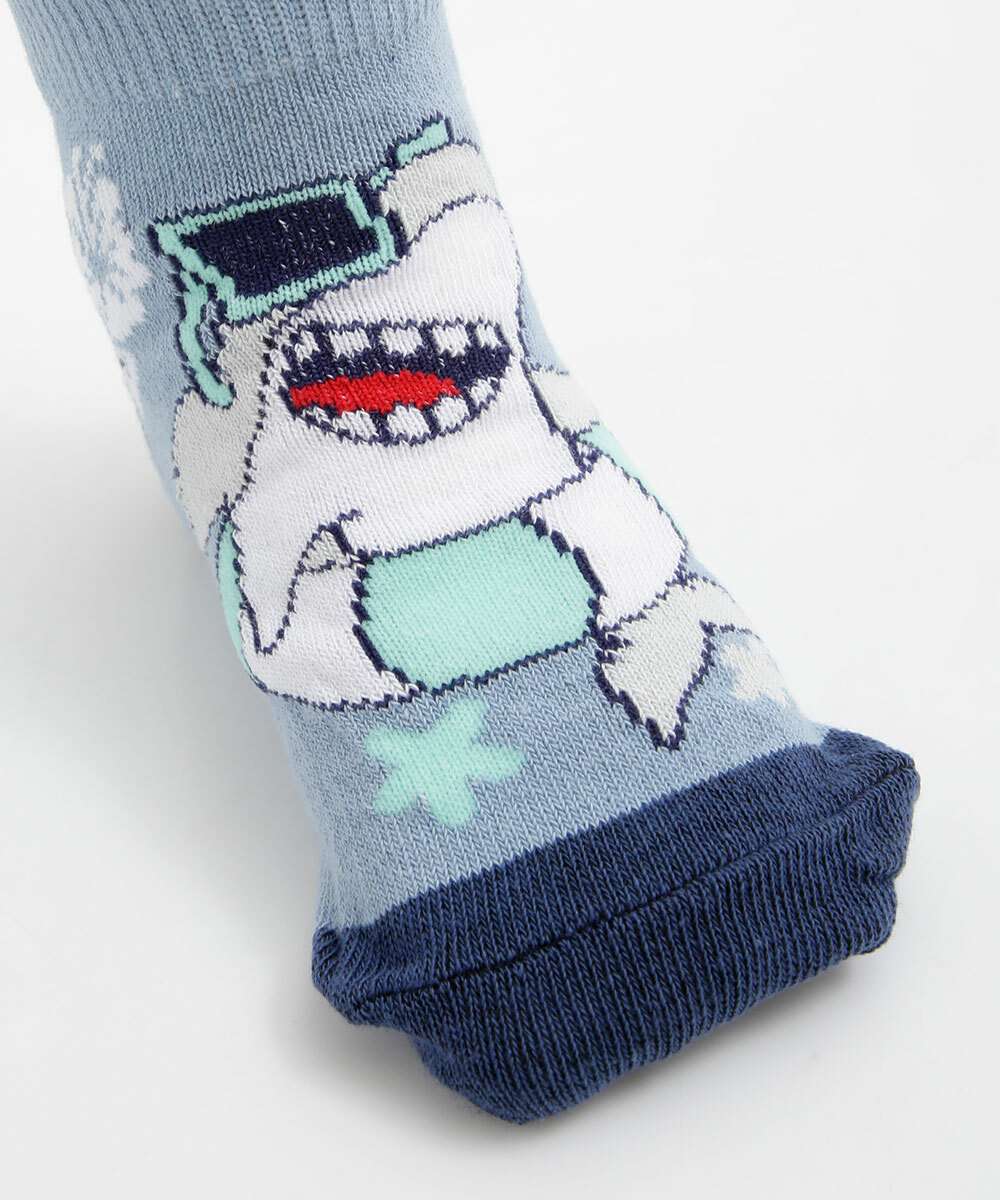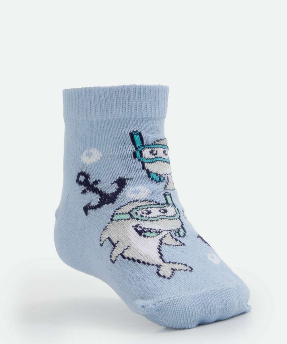 Kit infantil, composto por três pares de meias modelo cano curto, confeccionadas em malha. Possui um par liso e dois pares com estampa tubarão, acabamento em ribana e costura no tom.