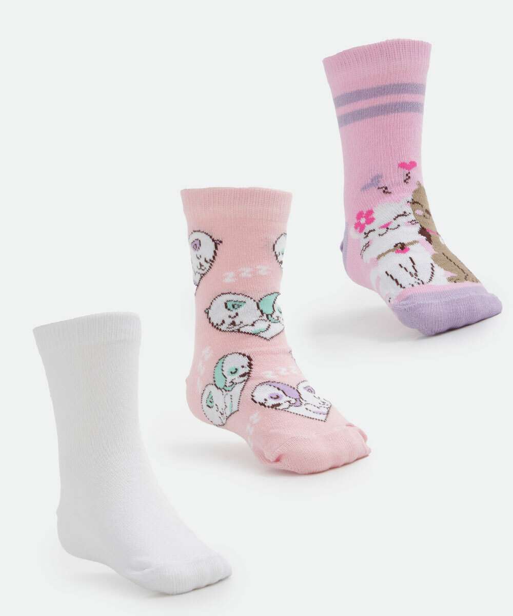 Kit infantil, composto por três pares de meias, modelo soquete confeccionadas em malha. Possui um par liso e dois pares com estampa animais, acabamento e ribana e costura no tom.