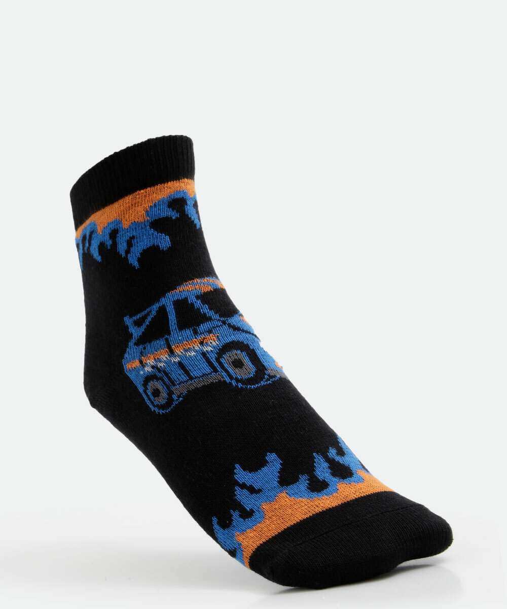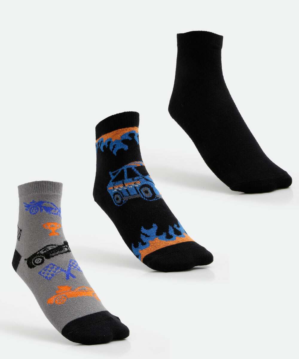 Kit infantil, composto por três pares de meias modelo soquete. Possui um par liso e dois pares com estampa de carros, acabamento e costura no tom.