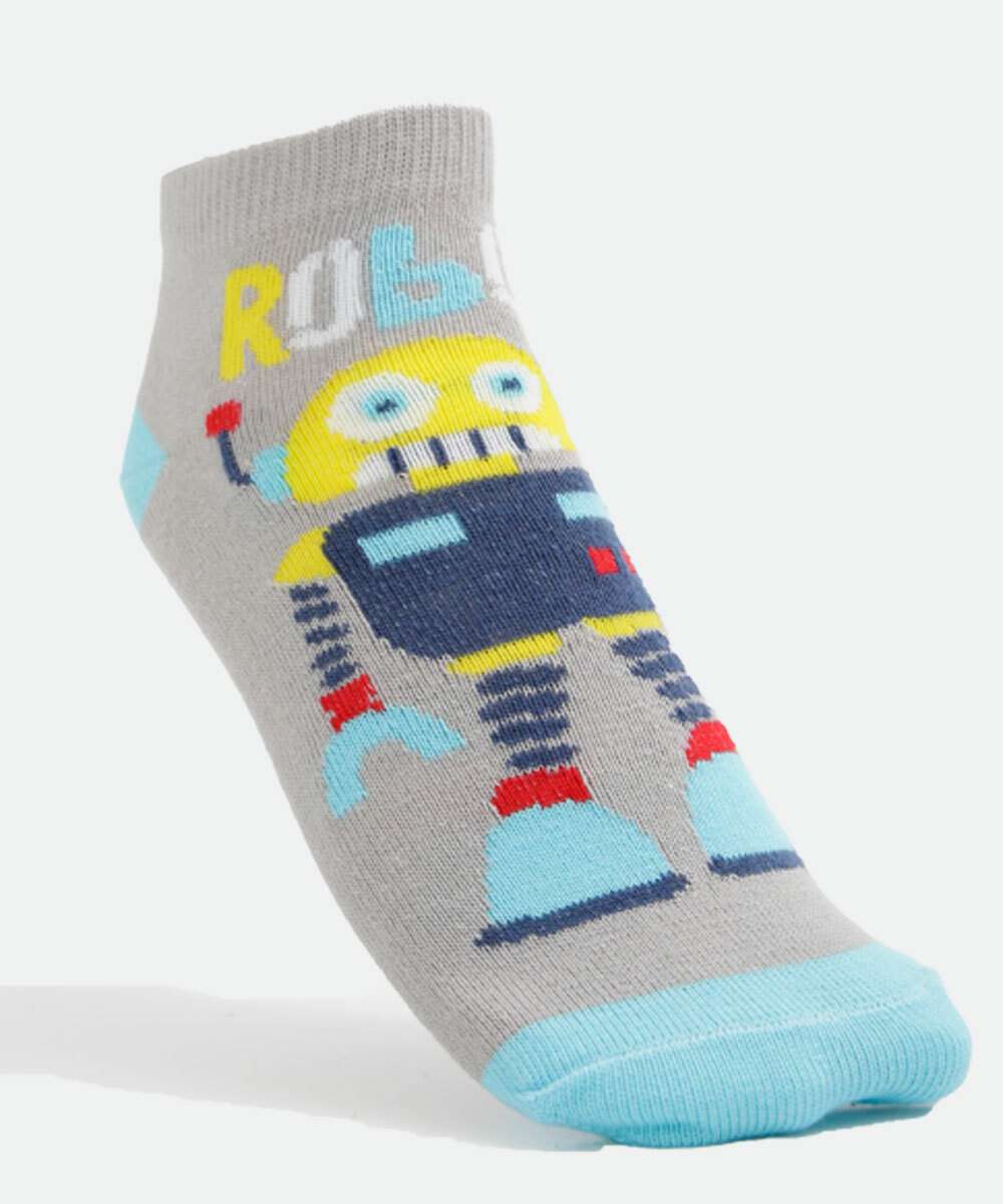 Kit infantil, composto por dois pares de meias modelo soquete, confeccionadas em malha. Possui um par liso e dois pares com estampa robô, acabamento em ribana e costura no tom.