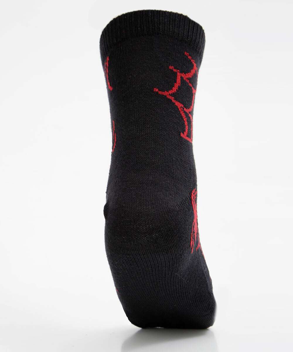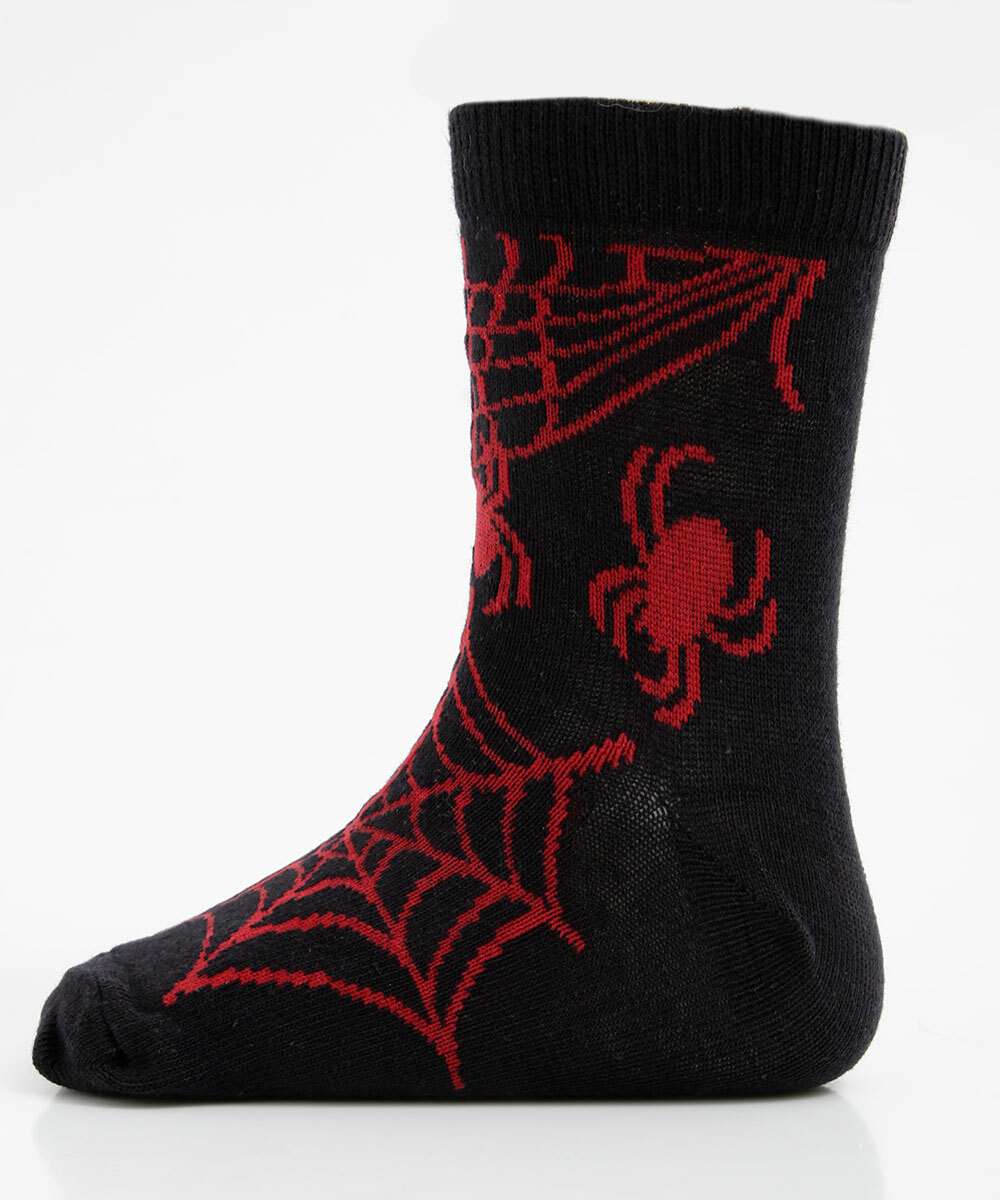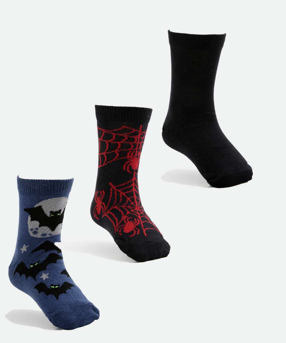 Kit infantil, composto por três pares de meias modelo soquete, confeccionadas em malha. Possui um par liso, uma par com estampa aranha e um par com estampa morcegos, acabamento em ribana e costura no tom.