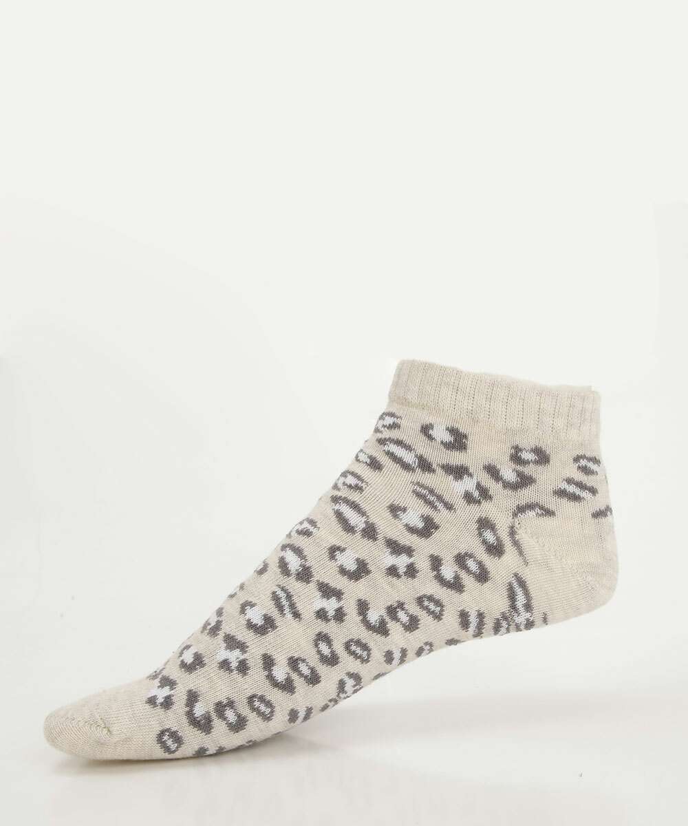 Kit feminino, composto por três pares de meias soquete, confeccionadas em tecido malha. Possui um par liso e dois pares com estampa animal print e listrada, acabamento em ribana e costura no tom.