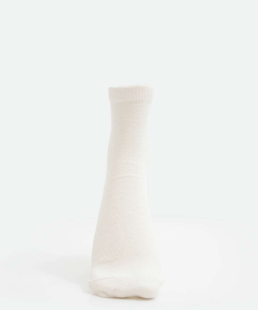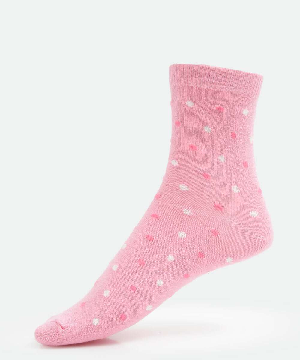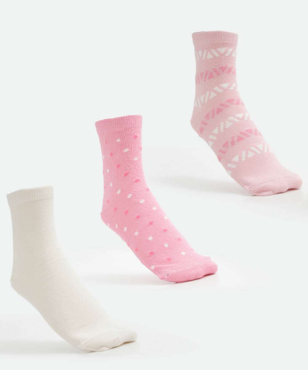 Kit feminino, composto por três pares de meias modelo soquete, confeccionadas em malha. Possui um par liso, um par com estampa geométrica e um par com estampa poá, acabamento em ribana e costura no tom.