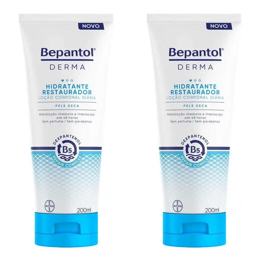 Kit com 2 Unidades de Bepantol Derma Hidratante Restaurador Loção Corporal 200ml. Bepantol Derma é uma loção corporal hidratante restauradora para uso diário. Indicada para pele seca e sensível, sua fórmula livre de conservantes e fragrâncias possui Niacinamida (vitamina B3), Dexpantenol B5, Glicerina e Lipídios naturais, ativos que ajudam a promover uma hidratação imediata e duradoura por até 48 horas. Tudo isso com uma textura leve, não oleosa e de rápida absorção que oferece alívio imediato para a pele ressecada. Para que serve a loção corporal hidratante Restaurador Bepantol Derma?Dermatologicamente testada, a loção corporal Bepantol Derma atua nas camadas mais profundas da pele, agindo de dentro para fora. Ela previne a recorrência da pele seca e deixa a pele mais suave e macia todos os dias. Benefícios e diferenciais da loção corporal hidratante Restaurador Bepantol DermaLoção corporal diária.Hidratação imediata e duradoura.Indicado para uso diário na pele seca e sensível.Textura leve, não oleosa e de rápida absorção.Alívio imediato para pele ressecada.Pele intensamente hidratada por até 48 horas.Possui Vitamina B3, que ajuda a acalmar a pele seca.Atua nas camadas mais profundas da pele, agindo de dentro para fora.Previne a recorrência da pele seca.Deixa a pele mais suave e macia.Livre de conservantes e fragrâncias.Possui Niacinamida / Vitamina B3, Dexpantenol B5, Glicerina e Lipídios naturais.Dermatologicamente testado.Como usar a loção corporal hidratante Restaurador Bepantol Derma?Aplique nas áreas ressecadas, como mãos, unhas, cutículas, cotovelos, joelhos e calcanhares. IngredientesDexpantenol, Niacinamida, Isoestearato Isopropílico, Óleo de argan e manteiga de karité. A lista de ingredientes usados na composição pode ser alterada pelo fabricante. Desta forma, recomendamos que você sempre leia a lista de ingredientes na embalagem do produto para garantir que são adequados para seu uso. Principais ativos e como atuamNiacinamida / Vitamina B3A vitamina B3, também conhecida como Niacinamida, é um ativo que ajuda a acalmar a pele seca. Dexpantenol B5A vitamina B5 é vital para a saúde da pele, ajudando na renovação natural e hidratação da pele. GlicerinaA glicerina é um ativo que proporciona hidratação imediata e prolongada. Lipídios naturaisEstes ativos substituem os lipídios perdidos na pele. AdvertênciasUso externo.Não ingerir.Caso haja contato com os olhos, lave-os abundantemente. Se houver irritação, suspenda o uso imediatamente e procure orientação médica.Mantenha fora do alcance das crianças.