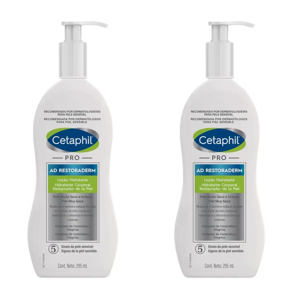 Kit com 2 Unidades de Cetaphil Loção Hidratante Pro Ad Restoraderm 295ml. Ideal para pele seca e/ou irritada, o Cetaphil Pro AD Restoraderm restaura a barreira natural da pele, aliviando a coceira e mantendo-a hidratada e protegida. Por meio da Tecnologia Barrier Repair, a loção hidratante aumenta a hidratação e o fluxo de água no estrato córneo (camada mais externa da pele), a partir de derivados da Filagrina, estimulando as Ceramidas que compõem os fatores naturais de hidratação e ajudam a restabelecer a função protetora da barreira cutânea. Para que serve o Cetaphil Pro AD Restoraderm?A loção Cetaphil Pro AD Restoraderm hidrata, acalma e alivia a coceira da pele atópica (com tendência a alergia), além de aliviar o ressecamento e irritação. Pode ser usado no rosto e corpo, reforçando o sistema de defesa natural da pele. Sua fórmula única é capaz de restaurar as três barreiras da pele atópica: microbiológica, física e química. Benefícios40,9% de melhora na hidratação da pele já na primeira hora após aplicação.Restabelece o microbioma, atenuando a proliferação de bactérias (S. aureus).Aumenta a hidratação e fluxo de água no estrato córneo (camada mais externa da pele) com a Tecnologia Barrier Repair.Pode ser usado a partir dos 3 meses de idade, com segurança e tolerabilidade confirmada.98,4% dos usuários sentiram que o produto alivia o ressecamento da pele.Como usar o Cetaphil Pro AD Restoraderm?Aplicar generosamente sempre que necessário ou conforme recomendação médica. Para obter melhores resultados, utilize imediatamente após o banho. Reaplicar sempre que necessário.