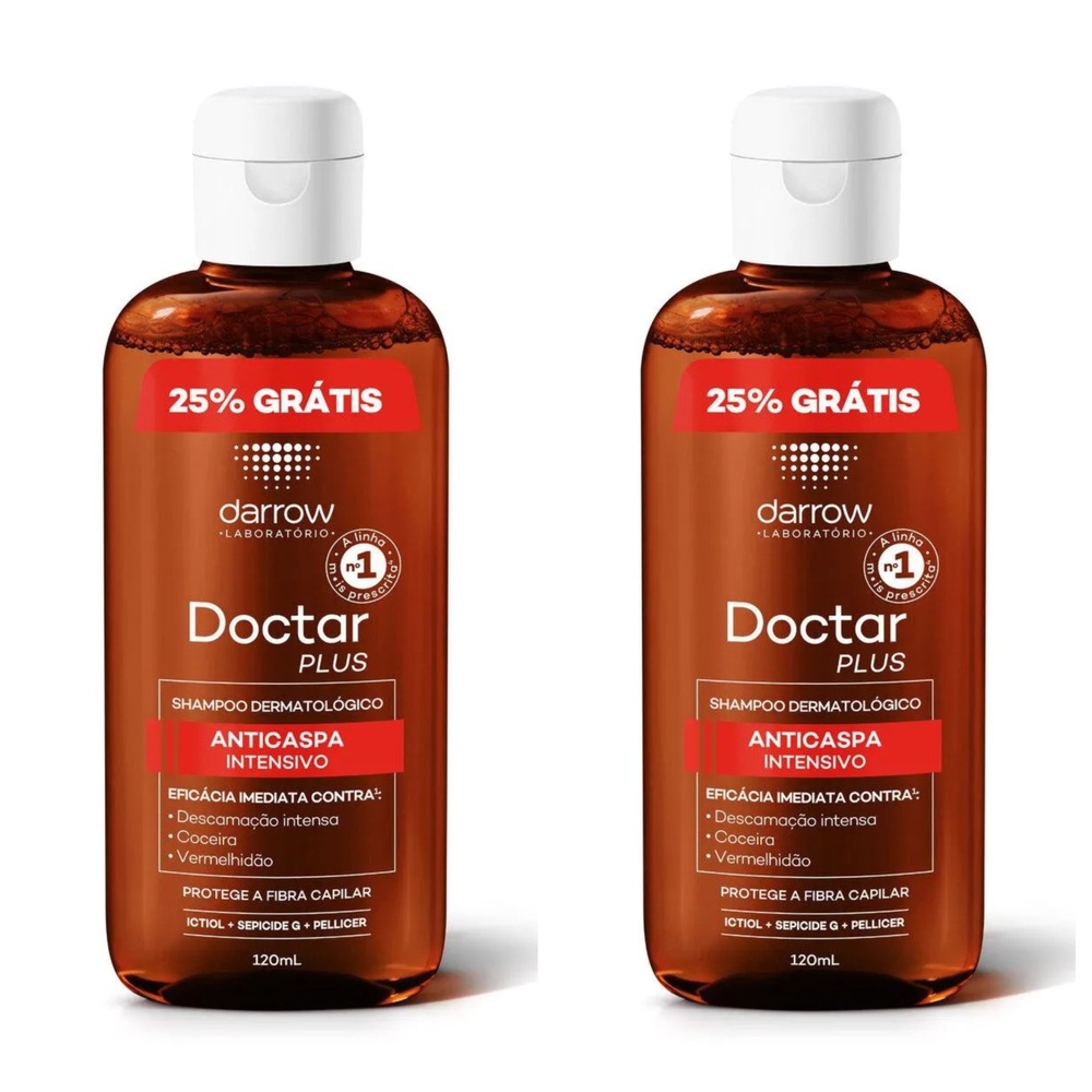 Kit com 2 Unidades de Darrow Doctar Plus - Shampoo Anticaspa 120ml. Doctar Plus da Darrow é um shampoo dermatológico anticaspa que oferece um tratamento intensivo no combate à descamação intensa, com resultados desde a 1ª aplicação. Sua fórmula é hipoalergênica e testada oftalmologicamente e dermatologicamente, livre de sulfato, parabenos, corantes e silicones, além de contar com 87% de ingredientes naturais. Para que serve o shampoo Darrow Doctar Plus?Indicado para o tratamento anticaspa, o shampoo Darrow Doctar Plus atua diretamente contra a descamação, coceira e vermelhidão, além de reduzir as caspas em 84% desde a primeira aplicação. Ele também ajuda a proteger a fibra capilar, sem ressecar os fios e garantindo uma sensação de frescor após o banho. Qual a diferença do Doctar para o Doctar Plus?O Shampoo Darrow Doctar agora se chama Darrow Doctar Plus, uma nova fórmula do shampoo anticaspa intensivo da linha mais recomendada por dermatologistas. Benefícios e diferenciais do shampoo Darrow Doctar PlusShampoo dermatológico anticaspa intensivo.Fórmula completa no combate à descamação intensa.Uma das linhas mais prescritas por dermatologistas.Combate as placas de caspa e impede a formação de novas.Testado oftalmologicamente e dermatologicamente.0% de sulfato e 87% de ingredientes naturais.Hipoalergênico.Sem parabenos, corantes e silicones.Eficácia imediata contra a descamação, coceira e vermelhidão.Protege a fibra capilar [Pellicer].Não resseca os fios.Deixa uma sensação de frescor.Reduz as caspas em -84% na primeira aplicação.Não testado em animais.Como usar o shampoo Darrow Doctar Plus?Aplique nos cabelos molhados, massageando o couro cabeludo de 1 a 2 minutos.Enxágue e repita a operação.O shampoo Doctar Plus pode ser usado diariamente até o controle da caspa e descamação nas primeiras semanas. Após esse período, para manter os resultados obtidos, é importante aplicar o produto de 2 a 3 vezes por semana ou conforme orientação do seu dermatologista. IngredientesIctiol, Ácido Salicílico, Óleo de Melaleuca, Sepicide G, Pellicer, Lactato de Mentila. AdvertênciasUso externo.Não ingerir.Caso haja contato com os olhos, lave-os abundantemente. Se houver irritação, suspenda o uso imediatamente e procure orientação médica.Mantenha fora do alcance das crianças.