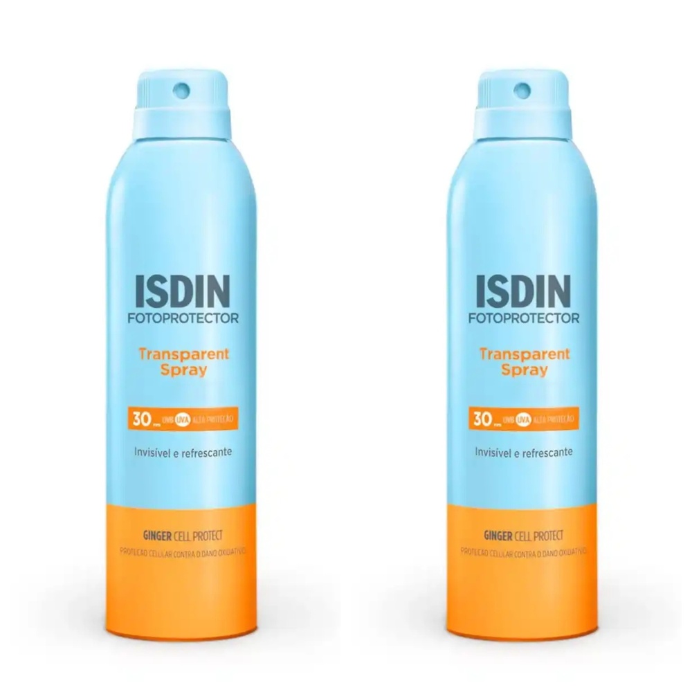 Kit com 2 Unidades de Isdin Transparent Spray Protetor Solar FPS30 250ml. O Isdin Transparent Spray FPS 30 é um protetor solar corporal em spray com textura invisível, leve e refrescante de rápida absorção. Ideal para todos os tipos de pele, incluindo pele sensível e reativa, sua fórmula conta com Ginger Cell Protect - Extrato de gengibre que oferece proteção celular contra o dano oxidativo. Além disso, é resistente à água, hipoalergênico e testado dermatologicamente. BenefíciosAlta proteção solar e muito resistente à água.Apto para todos os tipos de pele, incluindo pele sensível e reativa.Contém Ginger Cell Protect - Extrato de gengibre.Testado dermatologicamente e hipoalergênico.Como usar o Protetor Solar Corporal Isdin Transparent Spray FPS 30?Agitar antes de usar.Aplicar abundantemente sobre a pele, mantendo uma distância entre 4 e 5 cm, meia hora antes da exposição solar.Espalhar uniformemente até a absorção completa.Aplicar linhas de produto na pele e espalhar até cobrir toda a área a proteger.Reaplicar a cada 2 horas e sempre, após sudorese intensa, nadar ou banhar-se, secar-se com toalha e durante a exposição solar.Se a quantidade aplicada não for adequada, o nível de proteção será significativamente reduzido. É necessária a reaplicação do produto para manter a sua efetividade.AdvertênciasUso adulto.Evitar o contato com olhos e mucosas.Em caso de contato com os olhos, lavar abundantemente com água.Mantenha o produto fora do alcance das crianças.Não vaporizar no rosto.Este produto não oferece nenhuma proteção contra insolação.Evitar o contato com roupas.Assim como produtos similares, este produto pode manchar tecidos.PERIGO. Inflamável.Não pulverizar perto do fogo ou outra fonte de ignição.Recipiente sob pressão: risco de explosão sob a ação do calor.Manter afastado do calor, superfícies quentes, faísca, chama aberta e outras fontes de ignição.Não fumar.Não perfurar, nem incinerar, mesmo após utilização.Não expor ao sol e nem a temperaturas superiores a 50°C.Evitar a inalação direta deste produto.Utilizar apenas ao ar livre ou em locais bem ventilados.Proteger os olhos durante a aplicação e não pulverizar próximo dos olhos ou sobre pele lesionada ou irritada.Em caso de irritação, suspender o uso e procurar orientação médica.