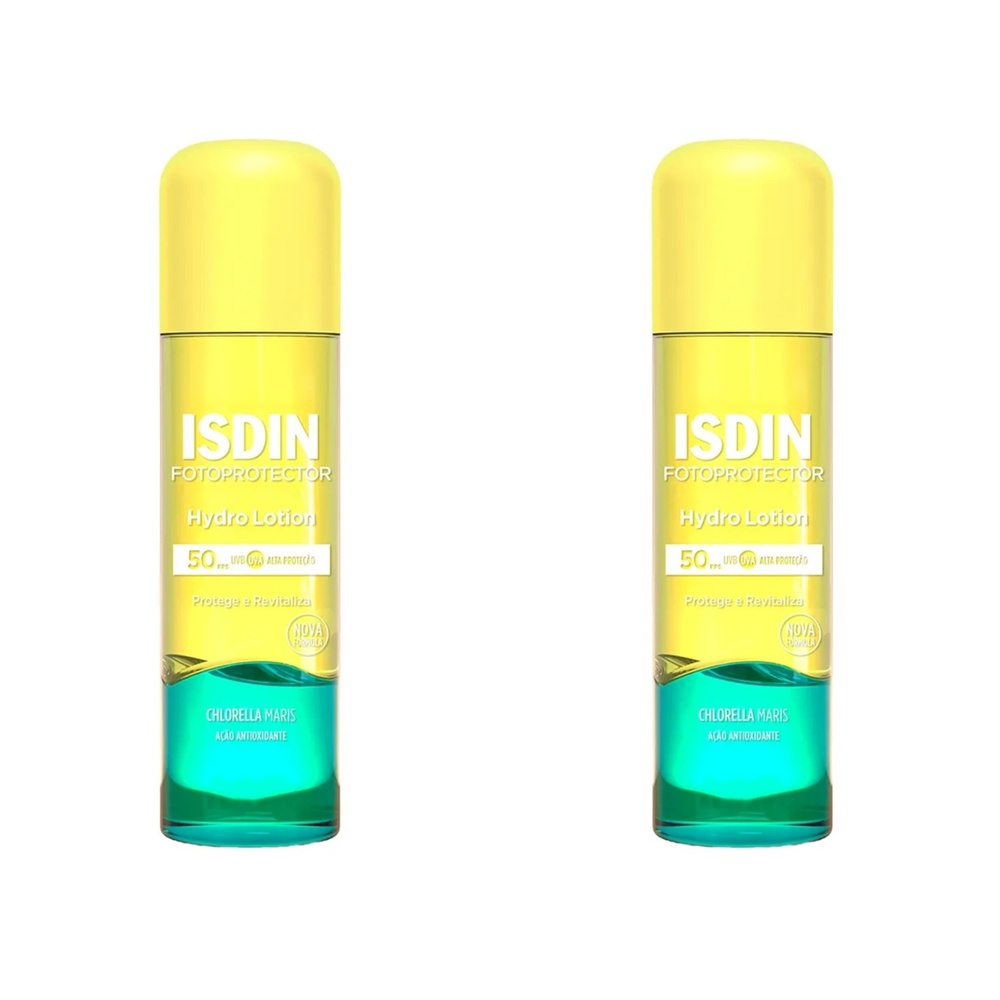 Kit com 2 Unidades de Protetor Solar Corporal Loção FPS 50 Isdin Fotop 200ml. Sempre pensando em trazer soluções inovadoras para a sua pele, a ISDIN apresenta o Isdin Hydro Lotion, o primeiro protetor solar bifásico que protege e oxigena a pele. Com alta proteção FPS 50, protege contra os raios UVA e UVB enquanto oxigena a pele, graças à tecnologia Sepitonic, com ação de reenergização e regeneração celular. Fórmula biodegradável. Testado dermatologicamente. Para que serve o ISDIN Hydro Lotion?Protetor Solar corporal indicado para todos os tipos de pele, inclusive as mais sensíveis. Protege contra os raios solares, é resistente à água, tem ação antioxidante, e ainda hidrata a pele, com uma textura que permite a absorção imediata. Uma vez aplicado e espalhado, desaparece na pele sem deixar resíduos. Sem álcool. Não testado em animais. Como funciona o ISDIN Hydro Lotion?O Protetor Solar ISDIN Hydro Lotion é o primeiro fotoprotetor bifásico, que além de promover alta proteção FPS 50, também oxigena a pele com a exclusiva tecnologia Sepitonic. O protetor aumenta os níveis de oxigenação, promovendo a reenergização e regeneração das células contra o estresse oxidativo causado pelo sol. Consequentemente, diminui a formação dos radicais livres, contribuindo no combate ao envelhecimento precoce da pele. O que são radicais livres?São moléculas liberadas pelo metabolismo do corpo, e igualmente combatidas pelo organismo a partir de uma produção natural de enzimas . Entretanto, essa produção de enzimas diminui com o passar do tempo, favorecendo o acúmulo de radicais livres, os quais provocam a degradação do colágeno e o consequente envelhecimento da pele. Benefícios e diferenciaisMuita alta proteção UVB FPS 50+ e UVA.Dupla Ação: protege contra os raios solares e oxigena a pele.Com a exclusiva tecnologia Sepitonic, que aumenta a oxigenação da pele.Ação hidratante, com absorção imediata.Resistente à água.Sem álcool.Fórmula biodegradável.Testado dermatologicamente.Não testado em animais.Para todos os tipos de pele, inclusive as mais sensíveis.Como usar o ISDIN Hydro Lotion?Agite por 5 segundos. Assegure-se que o produto foi devidamente misturado antes de qualquer aplicação. Aplique o Protetor Solar ISDIN Hydro Lotion generosamente sobre a pele seca meia hora antes da exposição solar. Quantidade insuficiente pode reduzir significativamente o fator de proteção. É necessária a reaplicação para manter a sua efetividade a cada 2 horas e depois de transpirar, nadar ou secar-se com uma toalha e durante a exposição ao sol. AdvertênciaUso externo.Não ingerir.Caso haja contato com os olhos, lave-os abundantemente.Se houver irritação, suspenda o uso imediatamente e procure orientação médica.Mantenha fora do alcance das crianças.