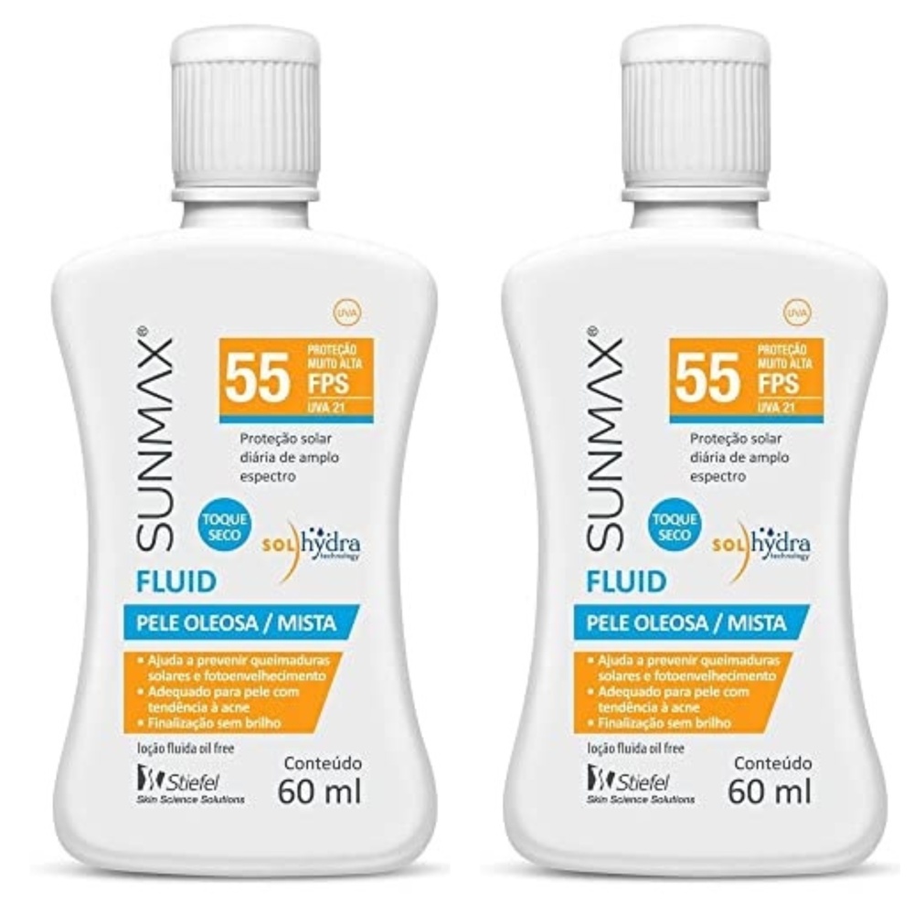 Kit com 2 Unidades de Protetor Solar sunmax fluido fps55 Oleosa/mista 60ml. Protetor Solar Sunmax Fluid FPS 55 é um protetor solar facial com alta proteção contra os raios UVA e UVB, desenvolvido especialmente para quem busca proteção solar eficiente sem abrir mão do conforto na pele. Com uma textura fluida e acabamento sem brilho, é ideal para uso diário, proporcionando proteção avançada sem deixar resíduos oleosos ou sensação pegajosa. Indicado para peles oleosas e com tendência à acne, o produto não obstrui os poros e foi formulado para evitar o surgimento de cravos e espinhas. Com sua fórmula inovadora, o Protetor Solar Sunmax Fluid FPS 55 oferece alta proteção solar enquanto cuida da saúde da pele, sendo hipoalergênico, sem álcool, corantes ou fragrâncias. Seu uso é recomendado para quem deseja proteger a pele dos efeitos nocivos do sol, prevenindo o envelhecimento precoce e manchas solares, sem abrir mão de um acabamento seco e confortável. Quais os benefícios do Protetor Solar Sunmax Fluid FPS 55?- Proteção solar clinicamente comprovada com hidratação;- Absorção rápida, formulação em loção fluida não oleosa;- Resistente à água;- Proteção solar diária;- Dermatologicamente testado. Modo de uso:1. SUNMAX Fluid FPS 55 deve ser aplicado abundantemente no rosto, pescoço e outras áreas que serão expostas à luz solar, no mínimo 30 minutos antes da exposição ao sol e sempre que necessário.2. Recomenda-se reaplicar o produto a cada 2 horas.3. Reaplicar sempre, após sudorese intensa, nadar ou banhar-se, secar-se com toalha e durante a exposição ao sol.