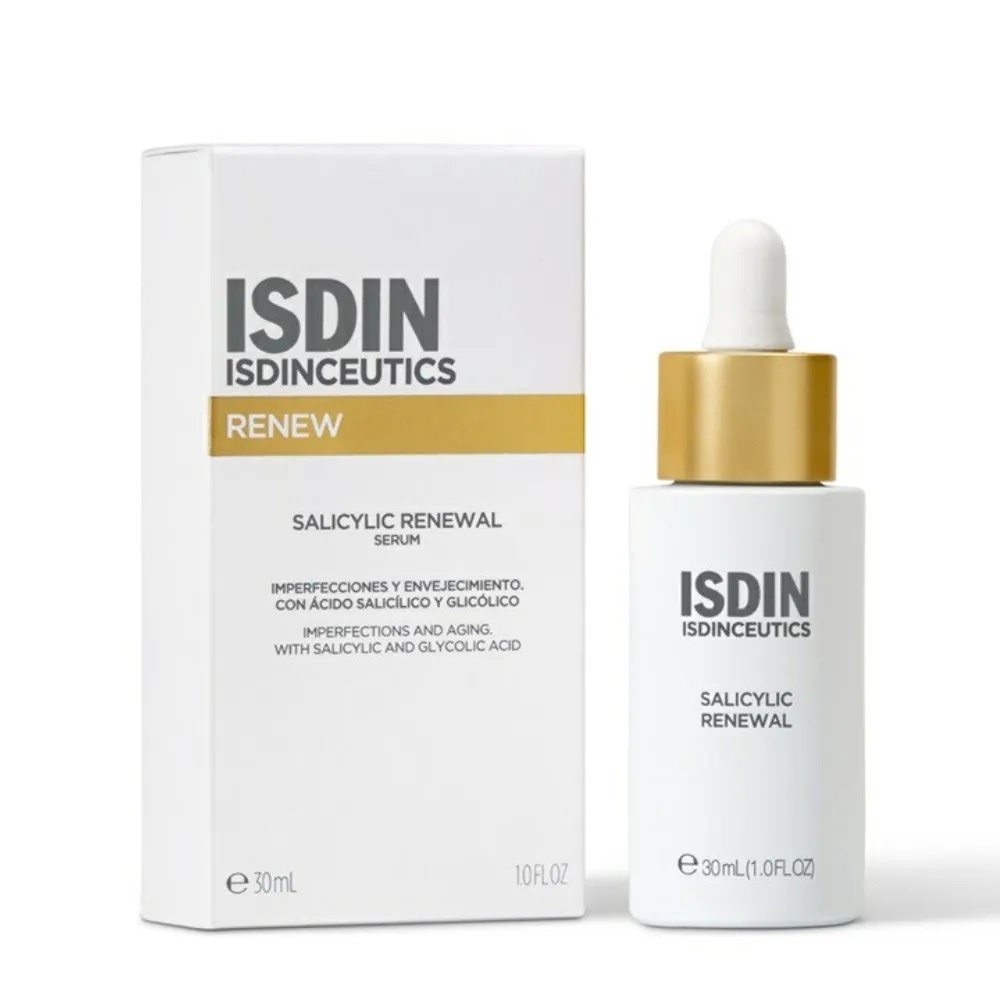Kit com 2 Unidades de Sérum Facial Antissinais Isdinceutics Salicylic Renewal Isdin 30ml. Isdinceutics Salicylic Renewal é um sérum facial de dupla ação antissinais e anti-imperfeições, ideal para peles mistas e oleosas. Sua fórmula inovadora, com o complexo Acid Renewal e Ácido Hialurônico, promove uma potente renovação da pele, reduzindo rugas, imperfeições, oleosidade excessiva, poros visíveis e comedões. Com resultados visíveis em apenas 2 semanas, proporciona 6 horas de controle da oleosidade com uma única aplicação, matificando a pele, melhorando sua textura e uniformizando o tom. Para usar, agite bem, aplique 2 a 3 gotas na pele limpa e seca (evitando a área dos olhos) pela manhã e à noite, antes do hidratante e protetor solar. Na primeira semana, use em dias alternados e em pequenas quantidades. Isdinceutics Salicylic Renewal é um sérum facial com dupla ação: antissinais e anti-imperfeições, especialmente formulado para peles mistas ou oleosas. Sua fórmula combate os sinais da idade, as imperfeições da pele, reduz o excesso de oleosidade, poros visíveis e comedões. Com resultados visíveis de redução das rugas e oleosidade em apenas 2 semanas. Sua formulação contém o complexo Acid Renewal com 12% de ácidos em um blend único que promove +45% de efeito peeling auxiliando na renovação da pele. Dentre os principais ingredientes da sua fórmula estão presentes o ácido salicílico, ácido glicólico, ácido hialurônico e a gluconolactona. Isdinceutics Salicylic Renewal promove 6h de controle de oleosidade com uma única aplicação, matifica a pele, melhora a sua textura e reduz os poros visíveis. Isdinceutics Salicylic Renewal renova, matifica e unifica o tom da pele graças as suas ações anti-imperfeições, antissinais e oil control. Modo de uso: Antes da primeira aplicação, substituir a tampa pelo gotejador e mantê-lo durante todo o uso do produto. Durante a primeira semana de uso, aplicar pequenas quantidades de produto e usar em dias alternados. AGITAR BEM ANTES DE CADA UTILIZAÇÃO. Aplique 2 a 3 gotas na pele limpa e seca, duas vezes ao dia (de manhã e à noite), evitando a área dos olhos, antes de aplicar o hidratante e o protetor solar.