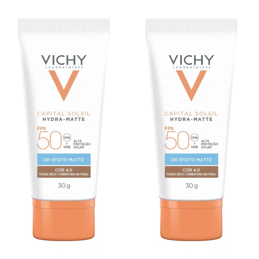 Kit com 2 Unidades de Vichy Protetor Solar Facial Capital Soleil Hydra-Matte Cor 4.0 FPS50 30g. O Vichy Capital Soleil Hydra-Matte é um protetor solar facial desenvolvido para todos os tipos de pele, inclusive mistas e oleosas. Com FPS 50, ele oferece altíssima proteção contra raios UVA, UVB e UVA Longo, além de ação antioxidante, efeito matte e controle de brilho por até 12 horas. Sua fórmula hidrata sem pesar e garante uma pele sequinha, protegida e confortável ao longo do dia. Com textura leve, toque seco e rápida absorção, o Hydra-Matte não deixa resíduos brancos, proporcionando uma sensação agradável e acabamento natural. CorCor 4.0 Princípios AtivosLHAPromove microesfoliação suave, ajudando a renovar a pele e uniformizar sua tonalidade. Glicirrizinato de DipotássioPossui propriedades calmantes que reduzem irritações e ajudam a uniformizar o tom da pele. NeohesperidinaPoderoso antioxidante que combate os danos dos radicais livres, prevenindo envelhecimento precoce e manchas. Benefícios e diferenciais do Vichy Capital Soleil Hydra-MatteOferece alta proteção contra os raios UVA, UVB e UVA Longo.Promove efeito matte e controle de brilho por até 12 horas.Possui ação antioxidante para prevenir danos causados pelos radicais livres.Hidrata sem pesar, mantendo a pele sequinha e protegida.Textura leve, toque seco e rápida absorção, sem resíduos brancos.Como usar o Vichy Capital Soleil Hydra-Matte?Aplique abundantemente sobre a pele do rosto e corpo 15 minutos antes da exposição ao sol.Reaplique após sudorese intensa, nadar, banhar-se ou secar-se com toalha.Durante a exposição ao sol, reaplique sempre que necessário.Evite aplicar quantidade insuficiente, pois isso reduz o nível de proteção.AdvertênciasEm caso de irritação da pele, suspenda o uso e procure orientação médica.Indicado para uso adulto.Este produto não oferece proteção contra insolação ou desidratação.Evite exposição prolongada ao sol.Uso externo.Não ingerir.Armazenar em local fresco e ao abrigo da luz.