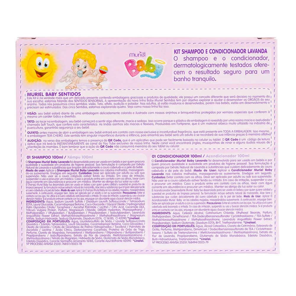 ESTE ANUNCIO CONTEM : 01 SHAMPO 100ML + 01 CONDICIONADOR 100ML LAVANDA Kit Shampoo e Condicionador Lavanda, São testado Dermatologicamenteoferecendo um banho tranquilo ao seu Bebê. Shampoo Muriel Baby 100mlO Shampoo Muriel Baby Lavanda foi desenvolvido para ser usado em bebês e por quemprocura Natural de Lavanda e substâncias que limpam delicadamente o couro cabeludo e apele do bebê.Modo de usar. Aplicar o Shampoo Muriel Baby Lavanda nos cabelos molhados,massagean-supervisāo. Nāo usar se o couro cabeludo estiver ferido ou irritado. Em caso deirritaçāo,suspender o uso e procurar um médico. Caso o produto entre em contato com osolhos, lavar com agua corrente em abundância e procurar um médico. Manter ao abrigo daluz solar ou calor.INGREDIENTS: Aqua, Sodium Laureth Sulfate / Disodium Laureth Sulfosuccinate /Tetrasodium Palm Glycerides Citrate/ Tocopherol / Ascorbyl Palmitate / Lecithin / CitricAcid, Cocamide DEA,Triticum Vulgare Protein, Parfum, Magnesium Chloride, DMDMHydantoin,Phenoxyethanol /Angustifolia Flower, Extract, Methylchloroisothiazolinone/Methylisothiazolinone / Magnesium Condicionador Muriel Baby 100mlO Condicionador Muriel Baby Lavanda foi desenvolvido para ser usado em bebês e porquem procura qualidade e suavidade em produtos de higiene pessoal. Sua formulaçāoécomposta por Extrato Natural de Lavanda e substâncias que cuidam delicadamente do courocabeludo e da pele do bebê. Modo de Usar: Aplicar o Condicionador Muriel Baby Lavanda noscabelos molhados, massageando-os suavemente. Enxágüe em seguida.Cuidados: Evitarcontato com os olhos. Deve ser aplicado por adulto ou sob sua supervisāo.Nāo usar se ocouro cabeludo estiver ferido ou irritado. Em caso de irritação, suspender o uso e procurarum médico. Caso o produto entre em contato com os olhos, lavar com água corrente emabundância e procurar um médico. Manter ao abrigo da luz solar ou calor.INGREDIENTS: Aqua, Cetearyl Alcohol, Cetrimonium Chloride, Ethylhexyl Stearate,Parfum,Methylparaben,Dimethiconol / TEA-Dodecylbenzenesulfonate/ Cyclotetrasiloxane /TEA-Sulfate /Methylchloroisothiazolinone / Methylisoathiazoinone, Lavandula AngustifoliaFlower Extract,Propylparaben,Sodium Glutamate, Disodium EDTA, BHT, Triethanolamine.*Linalool. Este Kit é na verdade mais que um delicado presente contendo embalagens graciosas e produtos de qualidade; ele possui um conceito diferente que será decisivo no momento daanjinho. Todos nós possuímos cinco sentidos: Visão, Tato, Olfato, Audição e Paladar. Nos adultos, já estão maduros e desenvolvidos, porém nos bebês, estão em desenvolvimento eprecisam ser estimulados. Dos cinco Sentidos, estamos explorando quatro. Veja como nossa linha faz isso. VISĀO: seu bebê estará diante de uma embalagem delicadamente colorida e ilustrada com nossos anjinhos e brinquedinhos protegidos por vernizes especiais que conferem à mesma umcaráter lúdico e divertido. TATO: ao tocar na embalagem, seu bebê começará a sentir algo diferente, macio e sedoso. Isso ocorre porque o plástico da embalagem é revestido por uma resina macia e aveludadapuericultura, garantirão a segurança a seu bebê. OLFATO: antes mesmo de abrir a embalagem seu bebê entrará em contato com nossa exclusiva e inconfundivel fragrância, que está presente em TODA A EMBALAGEM. Isso mesmo. AUDIÇĀO: no verso das embalagens temos a presença do QR Code, que é um aplicativo que pode ser facilmente baixado no celular ou tablet. O QR Code é um código de leitura orientação às mamāes. É bom lembrar que a ação do QR Code não consumirá memória do seu tablet ou celular.