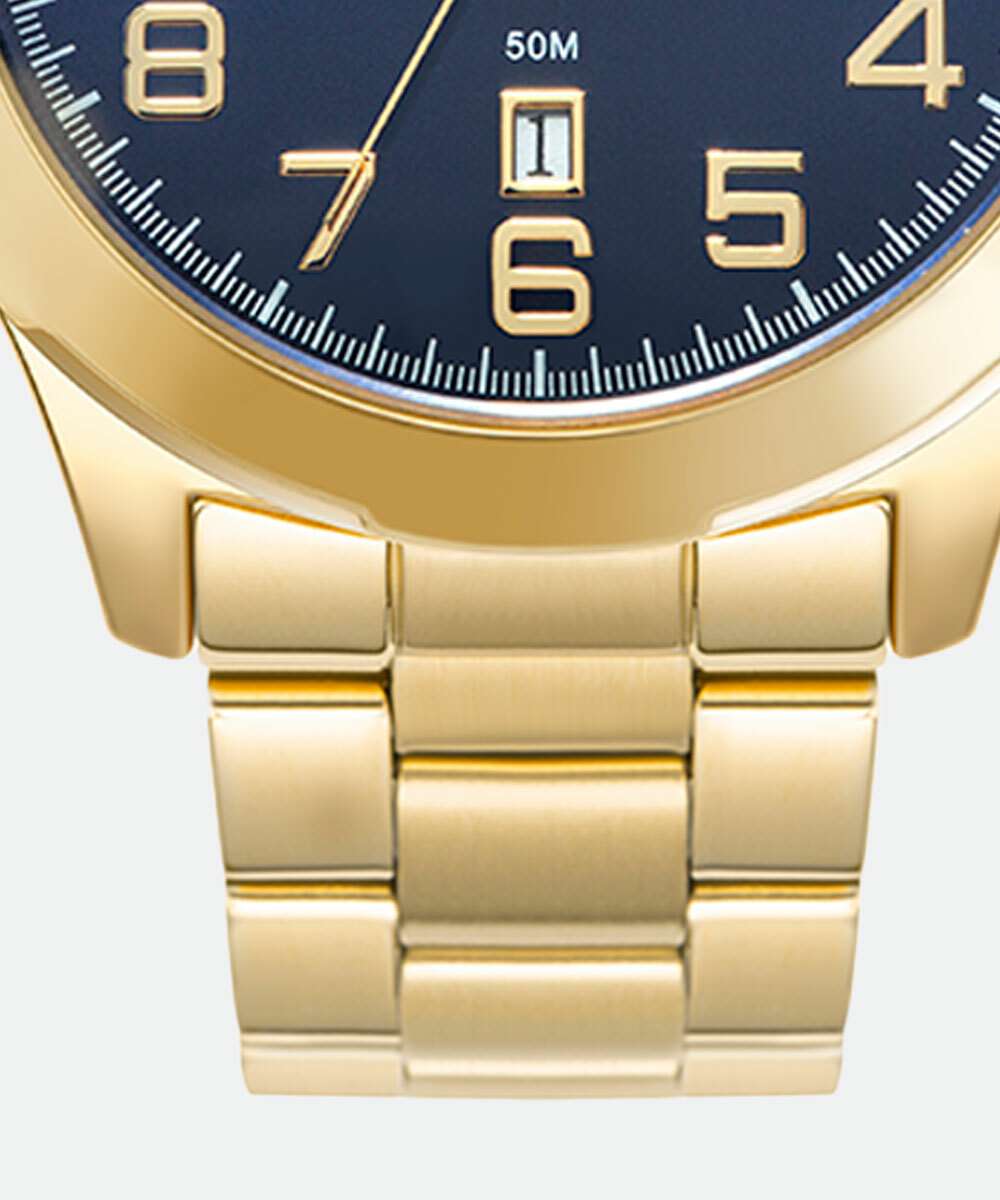 Relógio masculino com sistema analógico com ponteiros indicando as horas, minutos e segundos. Caixa em metal com vidro em cristal mineral e pino para ajuste de horas. Mostrador personalizado com calendário diário, indicadores númericos. Pulseira em aço trabalho com fechamento por botão lateral.