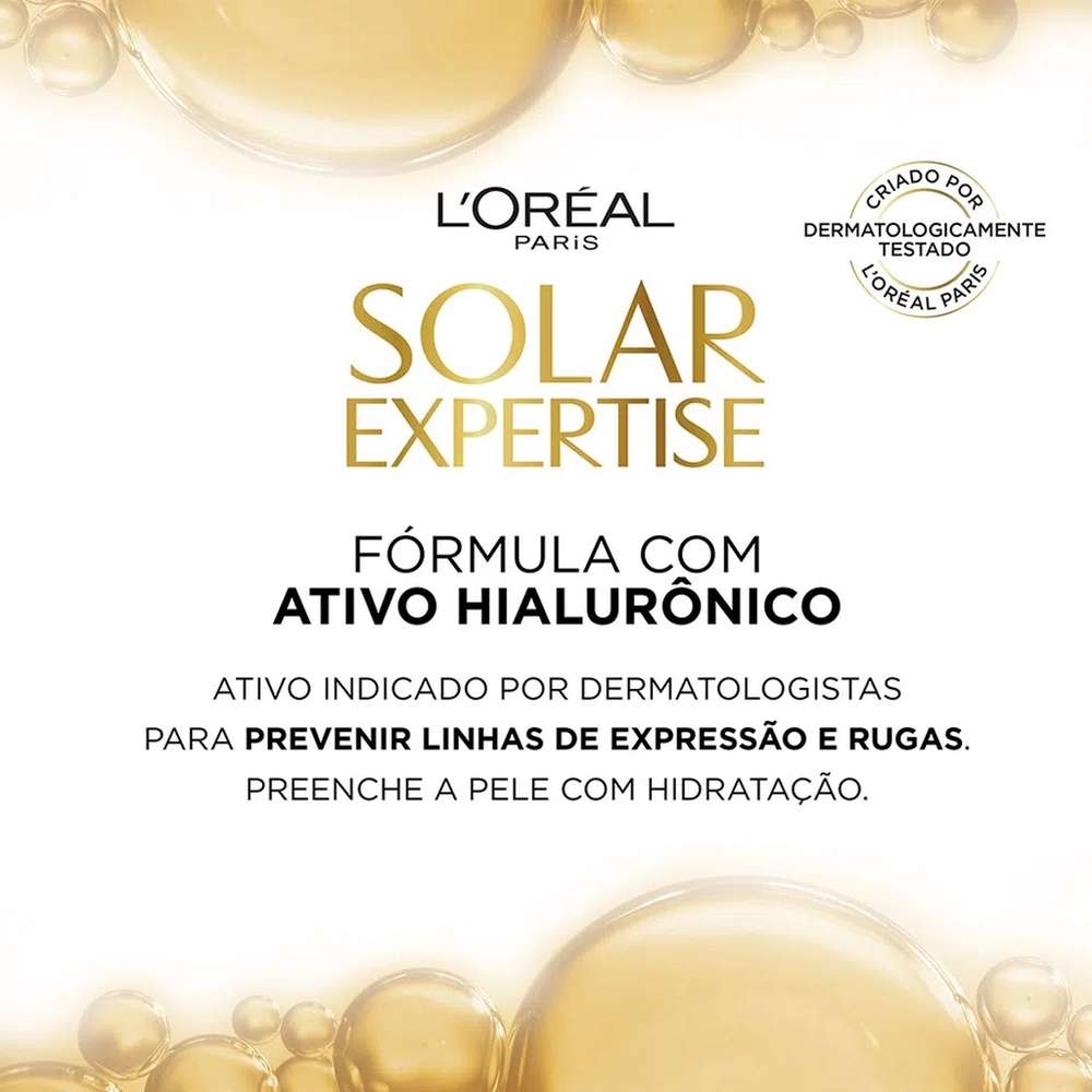 L’ORÉAL PARIS SOLAR EXPERTISE Antirrugas FPS 60 é um protetor solar facial de uso diário desenvolvido para todos os tipos de pele. Possui filtros solares de altíssima eficácia que entregam alta proteção contra os raios UVA/UVB, prevenindo o envelhecimento cutâneo provocado pela exposição ao sol (rugas e manchas solares). Dupla ação antienvelhecimento: sua fórmula é enriquecida com Ativo Hialurônico que hidrata a pele, reduzindo e prevenindo o surgimento de rugas graças a sua ação preenchedora. Além de alta proteção UVA/UVB contra os efeitos do sol, possui textura leve e fácil de espalhar. Sua fórmula de alta tecnologia é de fácil aplicação, possui rápida absorção oil-free e resistência à água. Seu rosto até 60 vezes mais protegido do que se você não tivesse aplicado o produto. BENEFÍCIOS:Alta proteção contra raios UVA e UVB.Rosto até 60 vezes mais protegido.Previne rugas e hidrata a pele, devido ao Ativo Hialurônico.Previne o envelhecimento solar.Previne rugas e manchas solares.Rápida absorção.Oil-free.PARA QUE É INDICADO?Indicado para todos os tipos de pele. COMO DEVO USAR?Aplique abundantemente sobre o rosto antes da exposição ao sol.É necessária a replicação do produto para manter sua efetividade:reaplicar sempre após sudorese intensa;nadar ou banhar-se, secar-se com toalha e durante a exposição ao Sol.Evite exposição ao Sol entre 10h e 16h;Evite o contorno sdos olhos;em caso de contato com os olhos lavar imediatamente. Contém: 1 unidade de L'Oréal Protetor Solar Facial Antirrugas Fps60 40g.