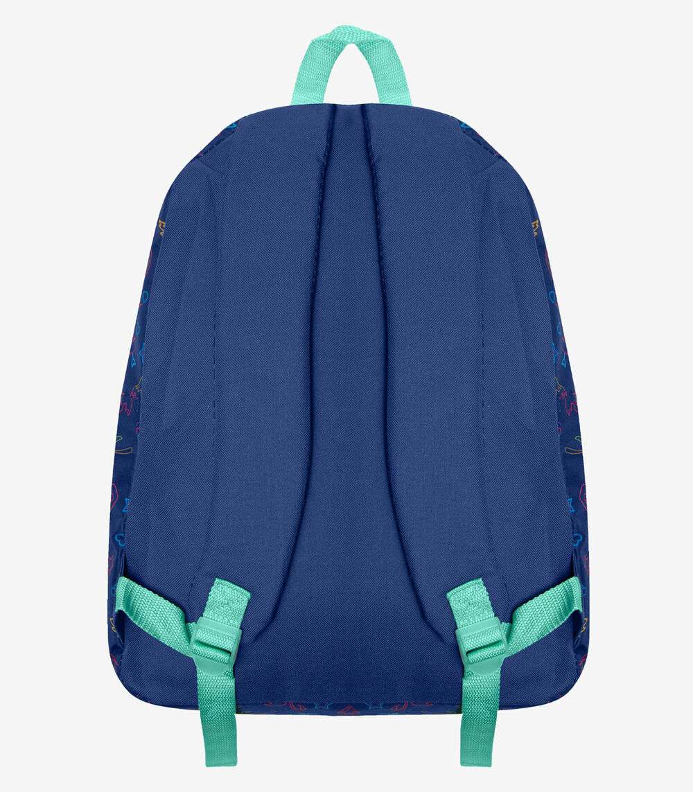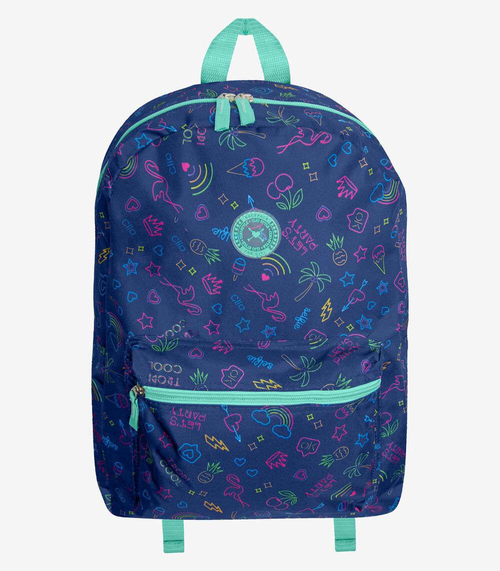 Mochila Clio. Mochila feminina confeccionada em material lona. Possui estampa, fechamento por zíper, repartição única, bolso frontal com fechamento por zíper, alça de mão, alças ajustáveis