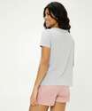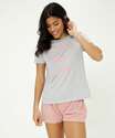 Pijama feminino, composto por blusa e short, confeccionados em malha poliéster e algodão. Possui blusa estampa frases, decote redondo, manga curta; short listrado, cós elástico, acabamento e costura no tom.