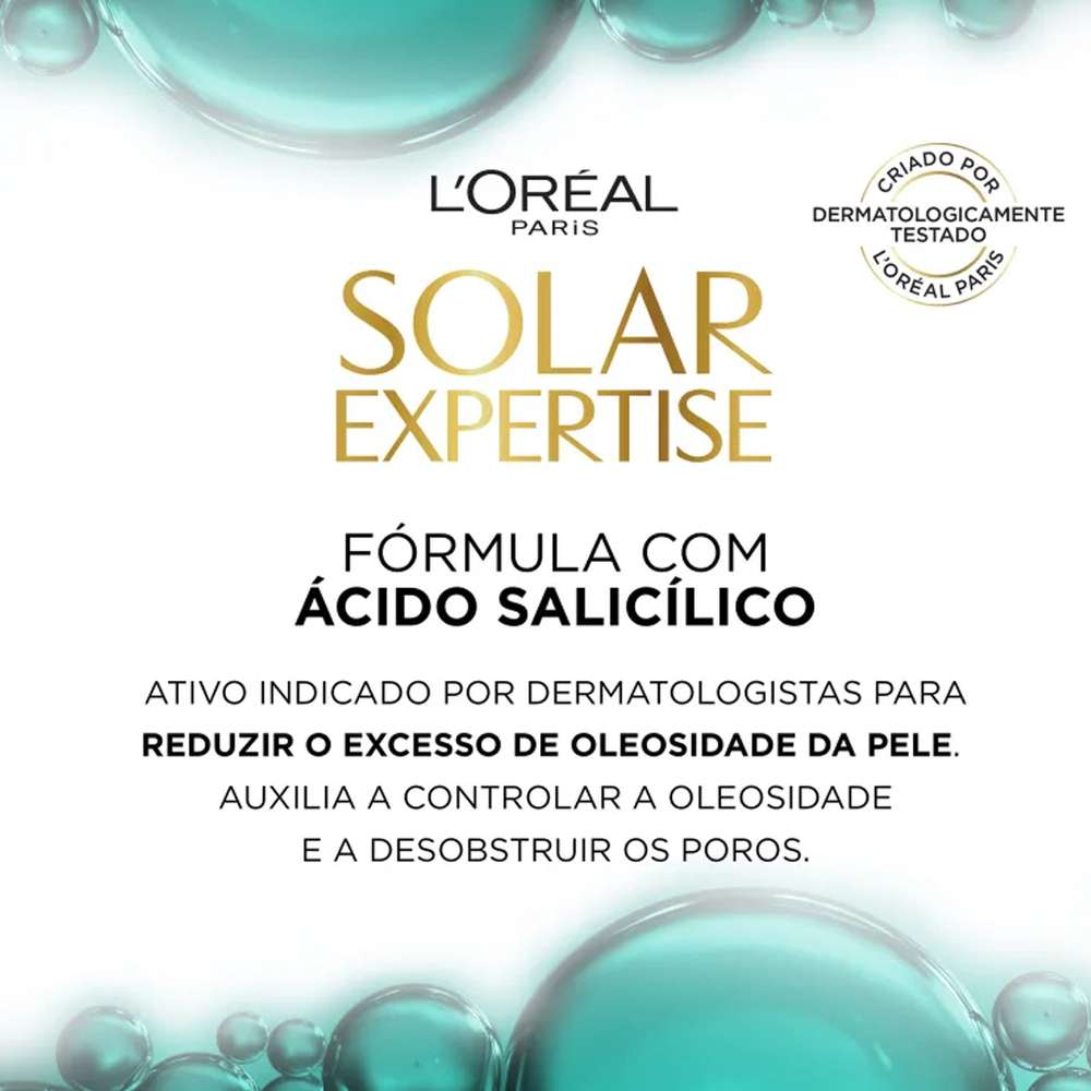 Protetor Solar Facial L'Oréal Paris Expertise Antioleosidade FPS 60 Modo de uso:Aplique abundantemente sobre a pele antes da exposição ao sol. É necessária a reaplicação do produto para manter sua efetividade: reaplicar sempre após sudorese intensa; nadar ou banhar-se, secar-se com toalha e durante a exposição ao sol. Evite exposição ao sol entre 10h e 16h. Evite o contorno dos olhos e, em caso de contato com os olhos, lavar imediatamente.Volume:40g Tipo: Protetor Solar BENEFÍCIOS: - Controla a oleosidade; - 12h de efeito matte; - Textura leve, fácil de espalhar e oil free; - Alta proteção contra raios UVA e UVB; - Previne o envelhecimento solar; - Previne rugas e manchas solares; - Previne contra queimaduras de sol; - Reduz o brilho; - Rápida absorção; - Oil-free. Uso: Corpo O NOVO L’ORÉAL PARIS SOLAR EXPERTISE ANTIOLEOSIDADE FPS 60 é um protetor solar facial de uso diário desenvolvido especialmente para peles oleosas. Sua fórmula possui filtros solares de altíssima eficácia que entrega alta proteção contra os raios UVA/UVB e Ácido Salicílico, ativo muito utilizado por dermatologistas para reduzir o excesso de oleosidade, garantindo assim uma sensação de pele limpa com 12h de efeito matte e prevenindo o envelhecimento cutâneo provocado pela exposição ao sol (rugas e manchas solares). Além de alta proteção UVA/UVB contra os efeitos do sol, possui textura leve e fácil de espalhar. Sua fórmula com Ácido Salicílico de alta tecnologia controla a oleosidade com efeito matte 12h, possui rápida absorção oil-free e resistência à água. BENEFÍCIOS: - Controla a oleosidade; - 12h de efeito matte; - Textura leve, fácil de espalhar e oil free; - Alta proteção contra raios UVA e UVB; - Previne o envelhecimento solar; - Previne rugas e manchas solares; - Previne contra queimaduras de sol; - Reduz o brilho; - Rápida absorção; - Oil-free.