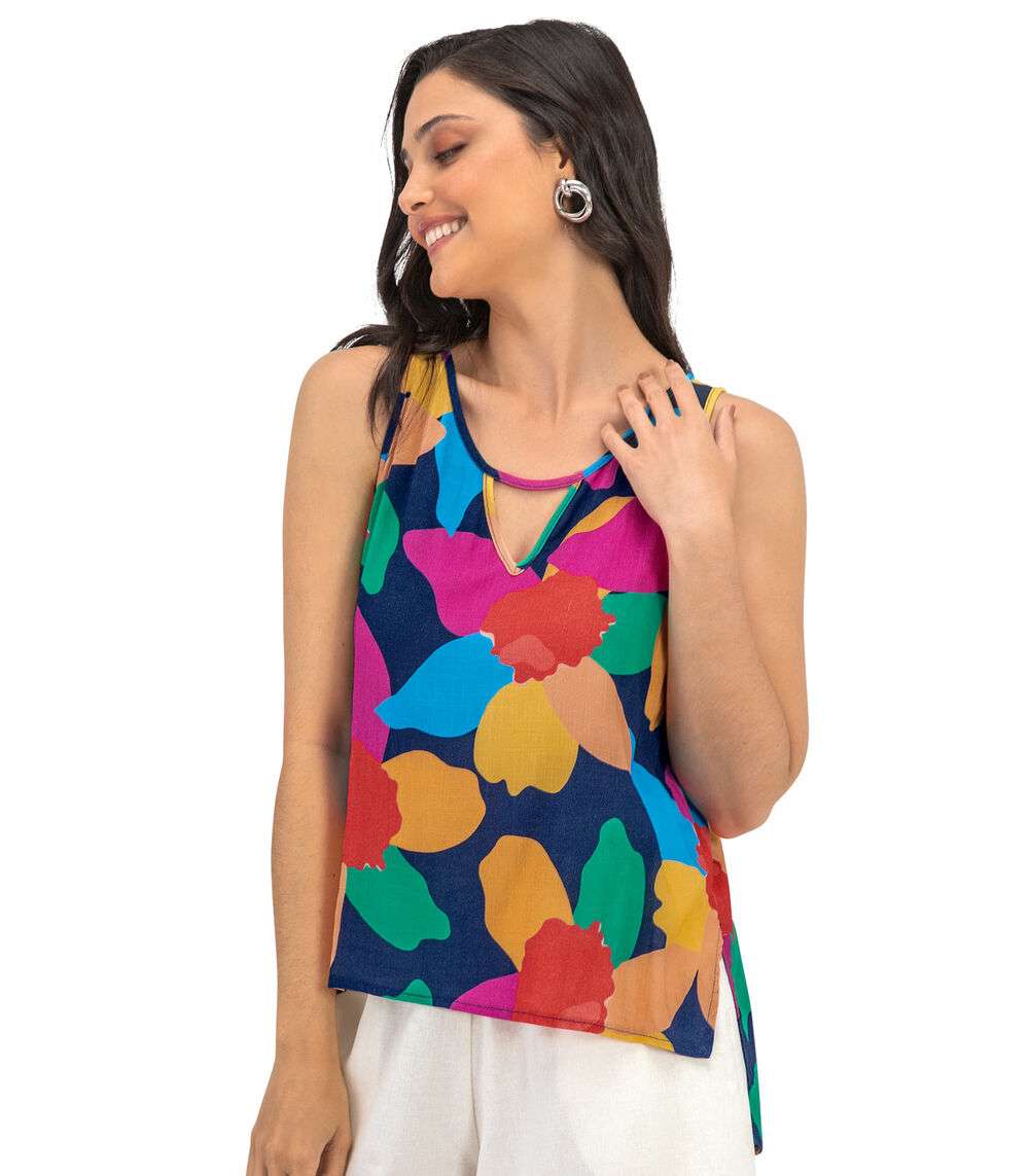 Regata Feminina Flores Assimétrica Rovitex Azul