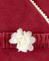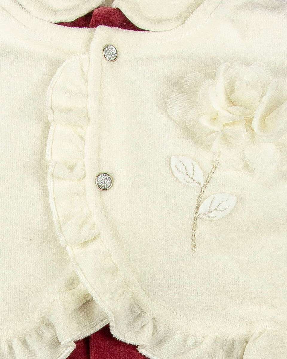 Saída de Maternidade composta por:- Macacão em Plush com colete frontal, detalhe de florzinha aplicada, babados franzidos e abertura com botões metálicos com glítter. Manta Dupla em Plush de 80 cm x 80 cm, barra com mini pompom aplicado e cinto com elástico embutido para segurar a manta no bebê.