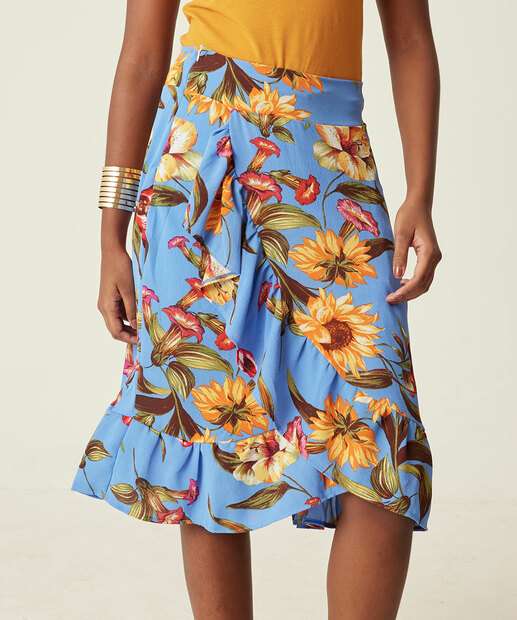 Saia feminina, modelo midi, confeccionada em tecido crepe. Possui cintura alta, forro, estampa floral, transpassada, barra com babado, acabameno e costura no tom.