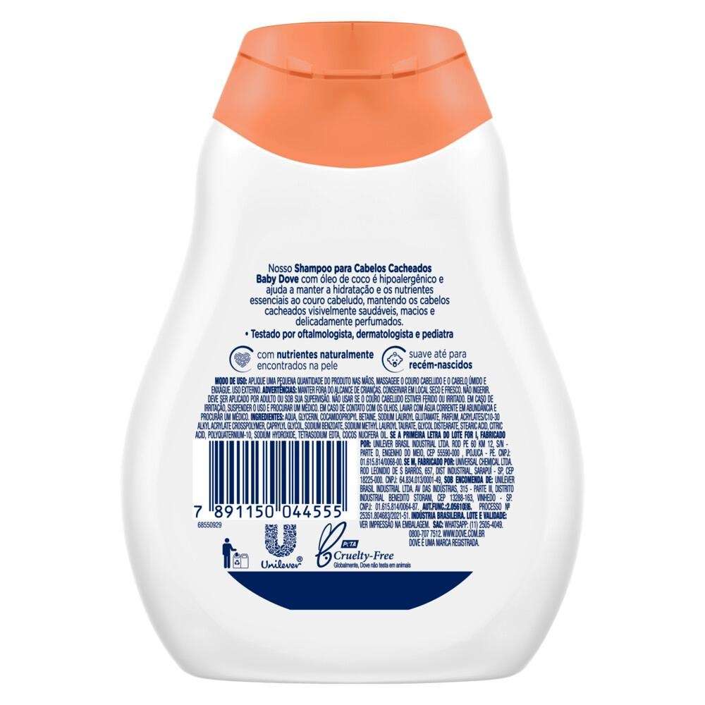 HipoalergênicoShampoo para cabelos cacheados com óleo de cocopH neutro para pele do bebêSem lágrimas, corantes, parabenos, ftalatos, sulfatosSuave até para recém-nascidosCom nutrientes naturalmente encontrados na pele do bebê Nosso Shampoo para Cabelos Cacheados Baby Dove com óleo de coco é hipoalergênico e ajuda a manter a hidratação e os nutrientes essenciais ao couro cabeludo, mantendo os cabelos cacheados visivelmente saudáveis, macios e delicadamente perfumados. Criado com pH neutro e nutrientes naturalmente encontrados na pele do bebê, esse shampoo, cuida do delicado couro cabeludo do seu bebê e deixa com qualidade e resultados saudáveis ??desde seu primeiro uso, por isso, além de limpar delicadamente, ajuda a hidratar o couro cabeludo e os fios de cabelos, mantendo macios e bem cuidados. Aproveite toda hora do banho com essa atenção a fórmula hipoalergênica, suave e sem lágrimas do shampoo para cabelos cacheados com óleo de coco. Com um perfume delicado especialmente para pele do bebê, esse shampoo para bebês deixa os cabelos do seu pequeno saudável e ajuda a relatar hidratação e nutrientes essenciais com o uso. Após lavar os cabelos do seu bebê, experimente aplicar o Condicionador para Cabelos Cacheados Baby Dove após o shampoo, para ajudar a manter os fios dos cabelos macios e fácil de pentear. Testado por oftalmologista, dermatologista and pediatra. Modo de uso: Aplique uma pequena quantidade de produto nas mãos, massageie o couro cabeludo e o cabelo úmido e enxágue.