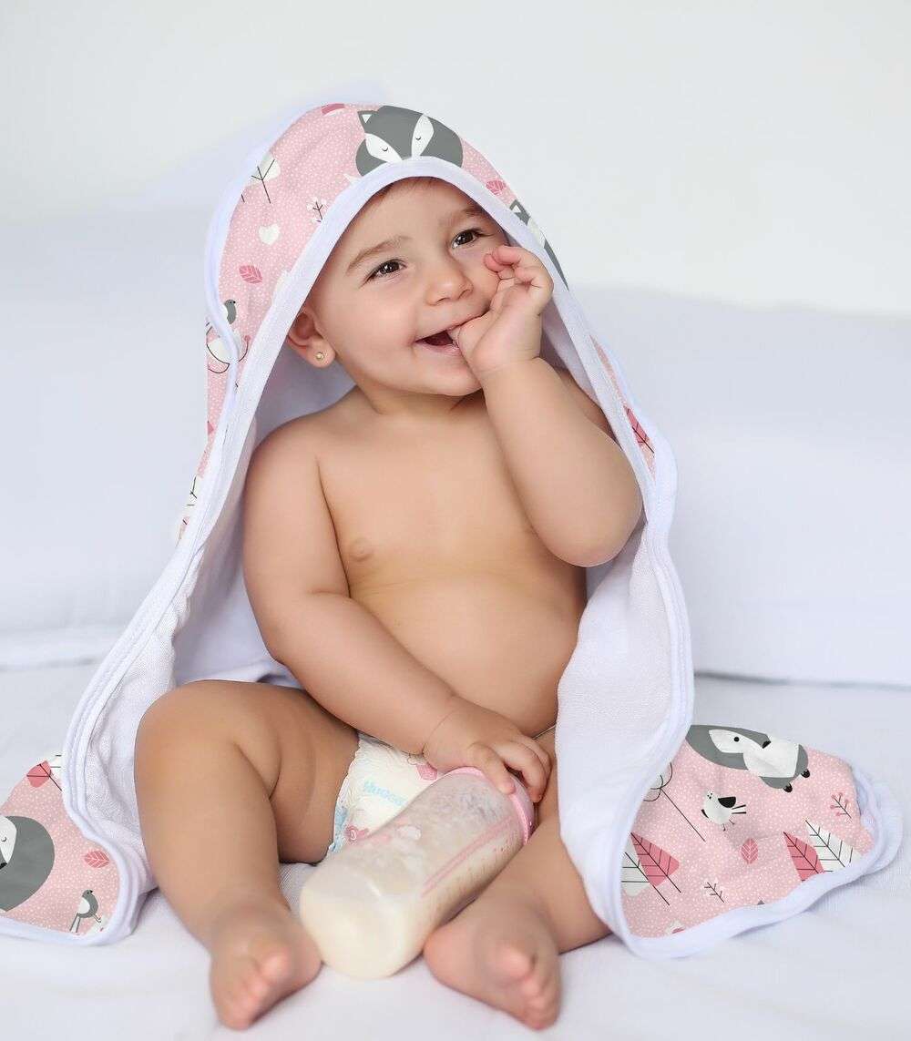 Toalha Com Capuz Baby Parte Confeccionada inteiramente em algodão, que é uma fibra 100% natural, parte interna atoalhada, leve, quentinha e de alta absorção. Extremamente macia, possui um lindo detalhe em viés nas bordas e conta com capuz, perfeito para proteger seus filhos do frio após o banho.