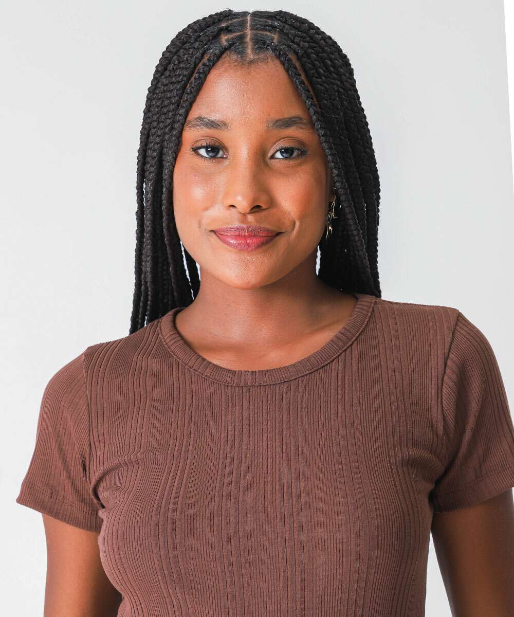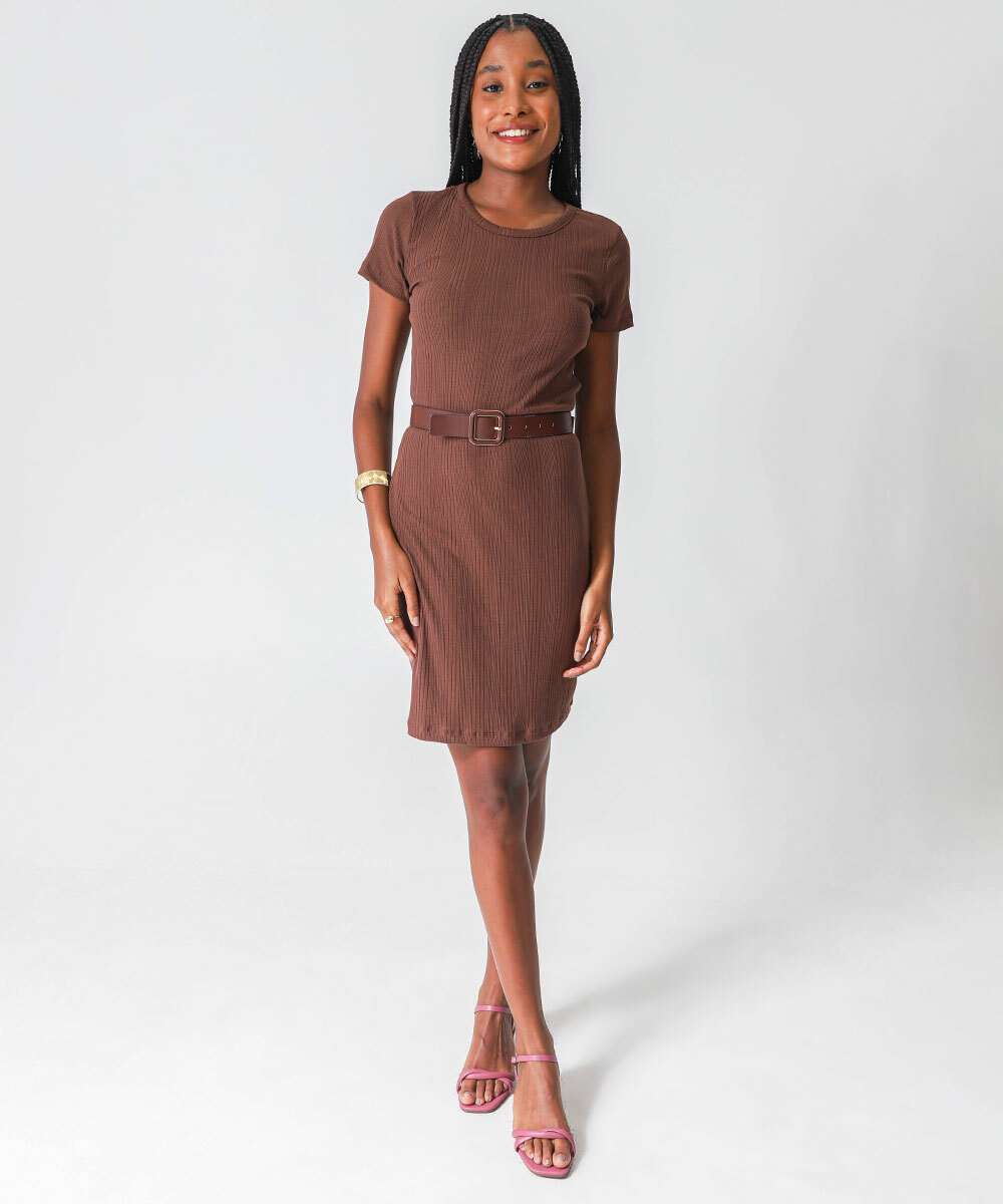 Vestido Feminino Canelado Manga Curta Marisa Marrom