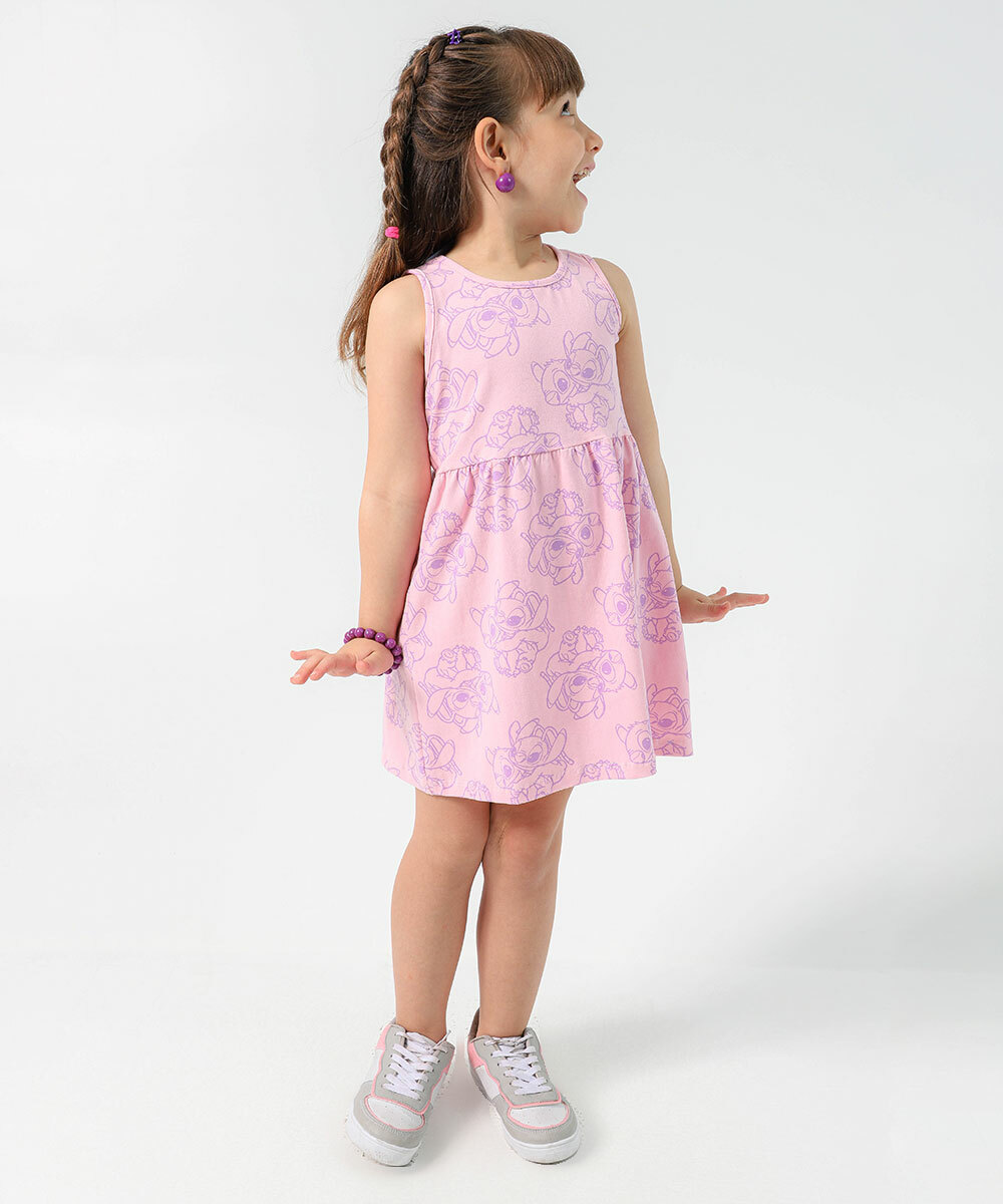 Vestido Infantil Estampa Stitch e Angel Tam 4 a 10 Rosa